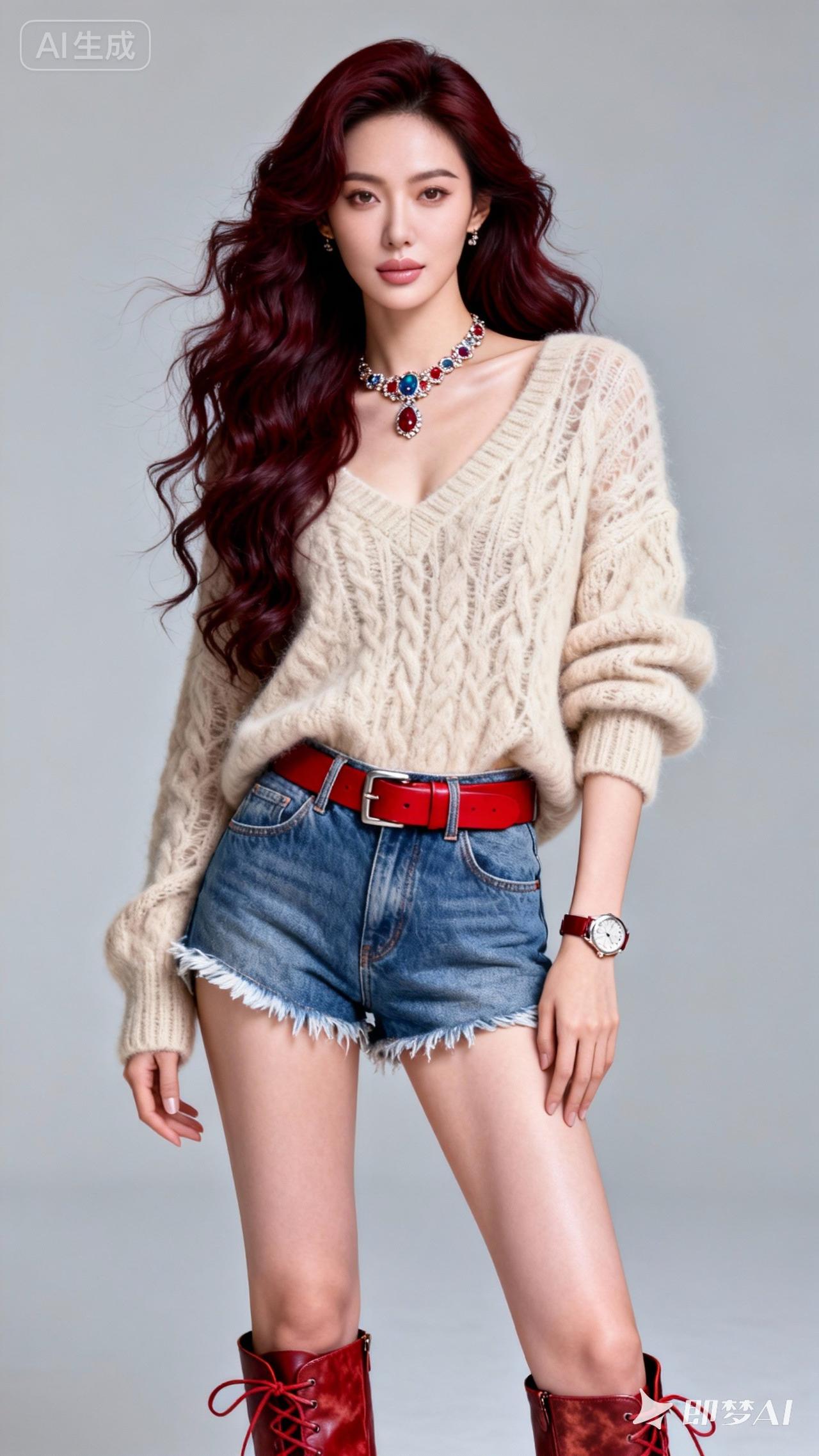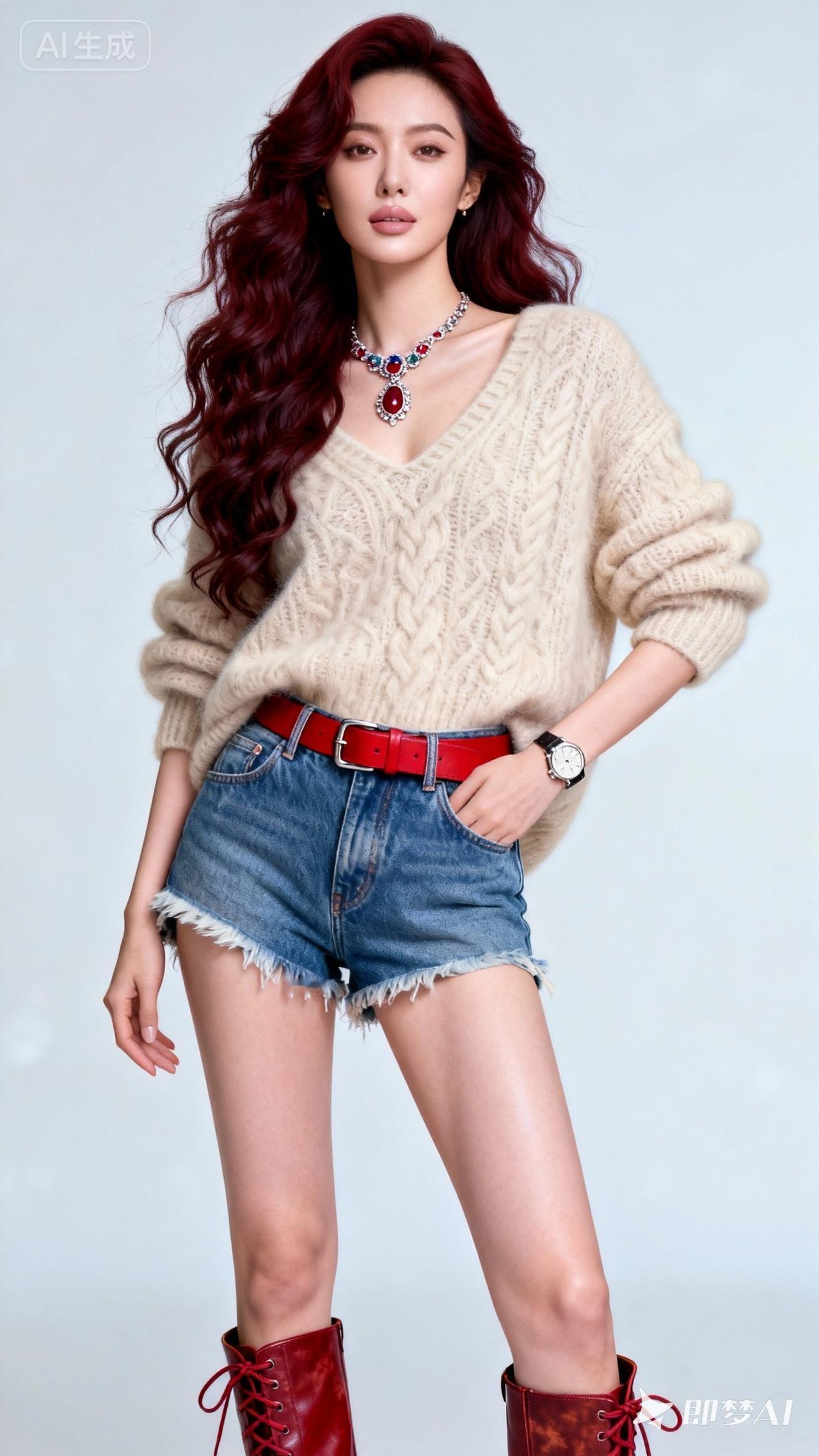 复古牛仔短裤搭配米色毛衣,红发少女复古穿搭,时尚又迷人!