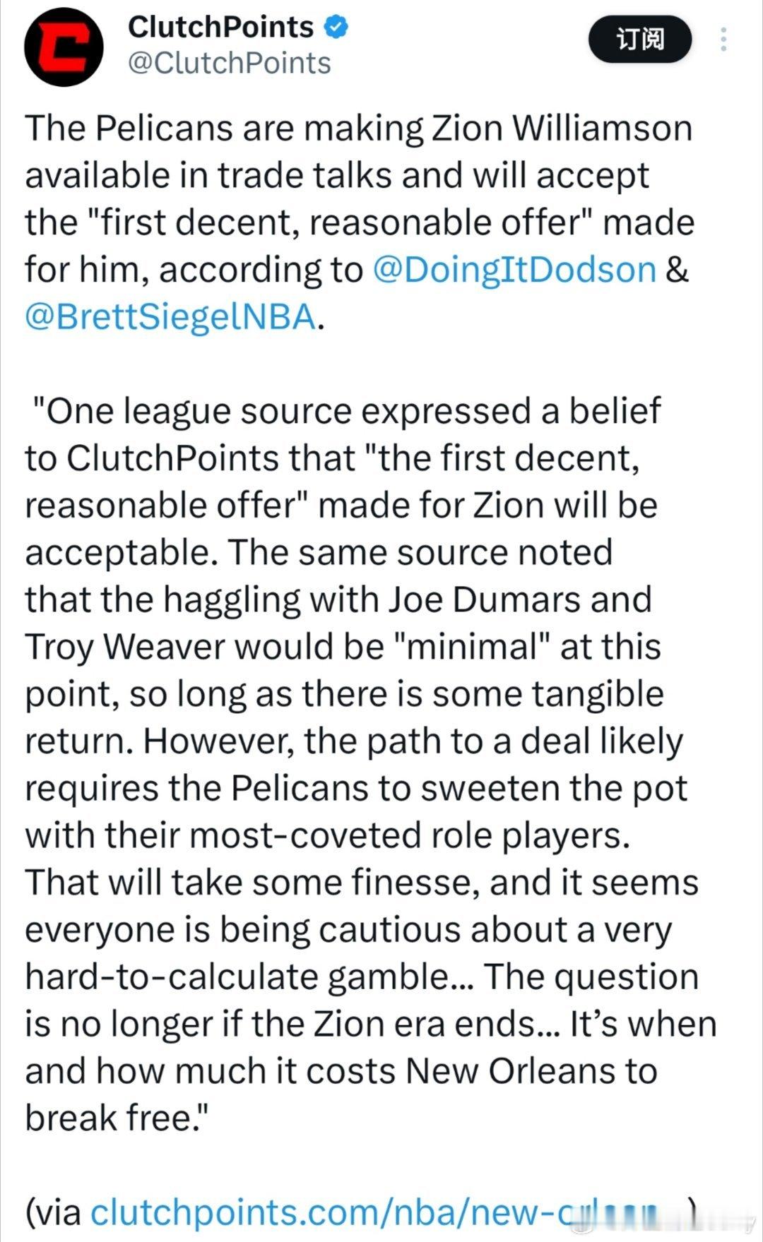 锡安被摆上货架,鹈鹕表示先到先得。Brett Siegel报道,鹈鹕将接受第一个关于锡安的合理、体面的报价。只要能得到一些实质性的回报,与乔·杜马斯和特洛伊·韦弗的讨价还价几乎可以忽略不计。问题已不再是锡安时代是否结束,而是何时结束。鹈鹕甚至需要为交易锡安,付出更多其他人心仪的角色球员。但这需要其他球队的技巧,因为大家都对锡安交易持谨慎态度。