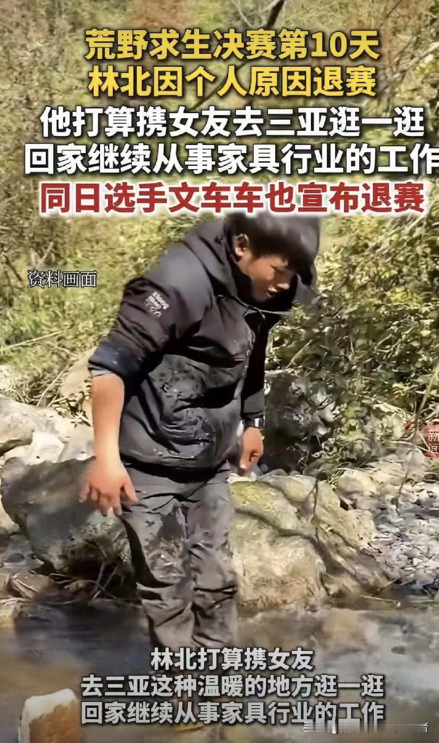 荒野乐观派小伙林北退赛了 看着他在山野里过得挺逍遥自在的,一天上蹿下跳,爬树摸螃蟹,对着山泉唱歌,把荒野当成一场旅行。退赛不是身体撑不下去,而是这段旅程他觉得圆满了,看到了很多想看的风景,去到了很多未到达过的地方。经历和感受了很多,所以知足了。 同样他也提到,决赛地非常的艰苦,对他这个荒野小白来说,活下去比较容易,活好很难,他更希望能有个很好的精神状态,能够带给大家开心,能够持续向阳而生,所以选择了退赛。 对于林北来说,出来时间长了想念家人和女友了吧!退赛回去带女友去逛三亚呢?荒野林北