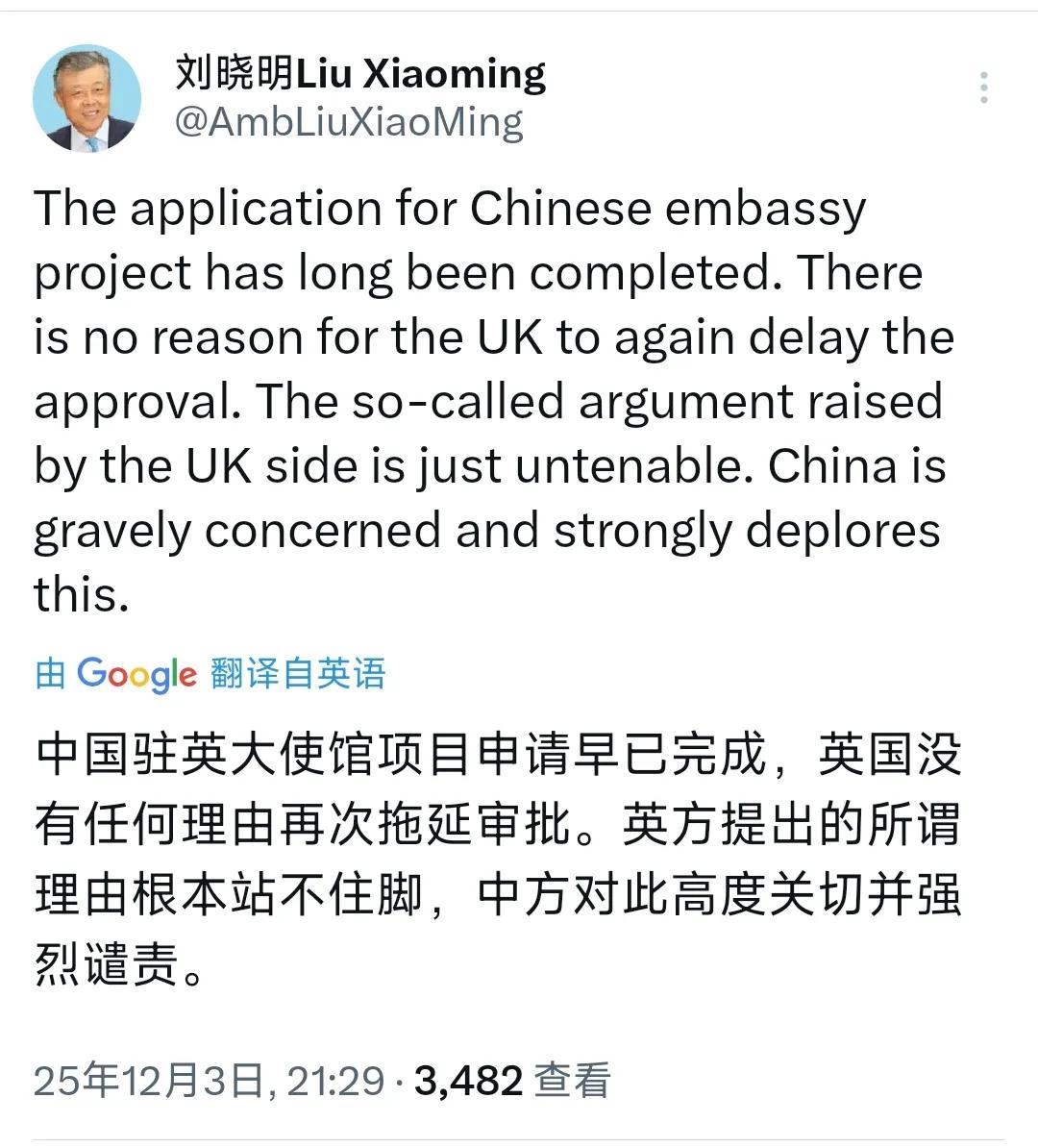 昨晚,中国驻英前大使刘晓明发文:“中国驻英使馆馆舍规划申请早已完备,英方再次推迟批准,没有任何道理,所谓的理由完全站不住脚,中方对此严重关切、强烈不满,我们将认真评估形势,维护自身正当利益。” [机智]英伦审批拖延术:馆舍申请成政治过家家?刘大使的中英文喊话,毫不留情地戳穿了英伦绅士的体面伪装——馆舍规划早已完备,英方却把审批玩成“无限期盲盒”,所谓理由怕不是从《傲慢与偏见》里抄的过时剧本?说好的契约精神呢?难道只适用于自家利益,到中国事务就切换双标模式,推迟一次是意外,反复推迟怕不是把使馆申请当对华博弈的小筹码? 英国既想又要,深陷内部分裂,中方的严重关切从不是空话,正当利益更不是谁能拿捏的软柿子,建议英方别在审批桌上浪费时间,不然最后可能发现,拖延症治不好,还得赔上外交信誉的挂号费!