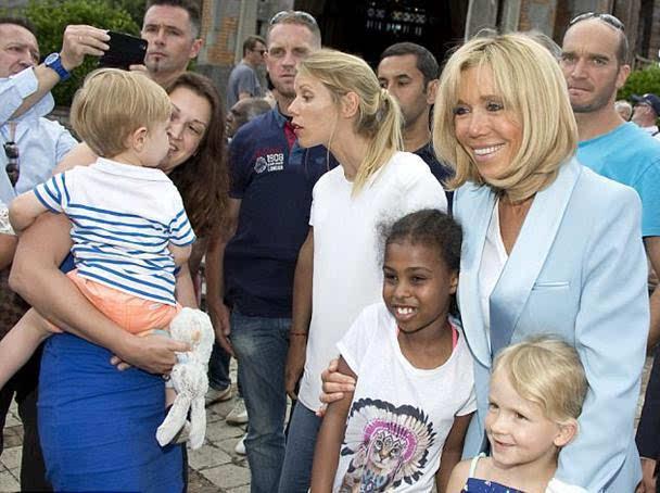 马克龙妻子和他的继女现身街头,这对母女俩一个抱娃一个逗娃,好有爱的画面。