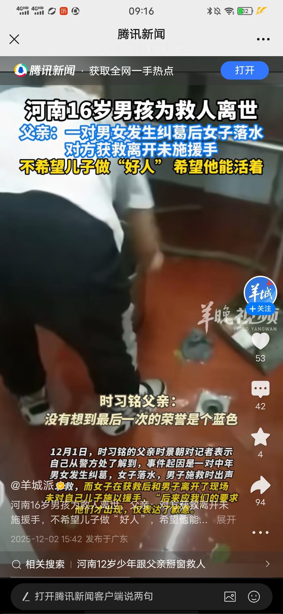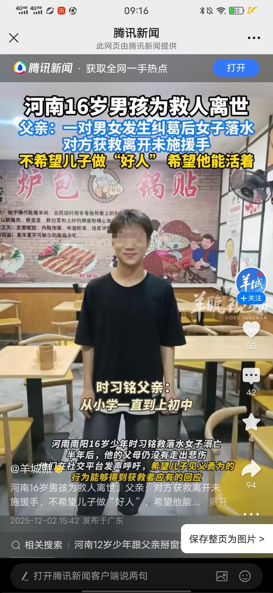 河南16岁男孩为救人离世,其父亲透露:对方获救离开未施援手,不希望儿子做“好人”,希望他能活着。 这个是刚在羊城派看到的消息。河南南阳16岁男孩时习铭,为了救人而溺亡,事情过去半年多,其父亲久久无法走出伤痛。 事情起因是一对中年男女,发生纠葛,女子落水,而男子在施救时发声求救,男孩时习铭伸出了援助之手,然而,当两人被救起后,居然不顾男孩死活,自己两个人就径直离开了现场,后来,还是应男孩家人的要求才出现,也只是表达了歉意。 男孩母亲因受不了打击,病倒了,父亲悲痛欲绝讲述孩子从小到大拿到的都是红色的奖状,最后拿了个蓝色的。 16岁啊,多么美好的年龄,多么美好的孩子,生命正要开始绽放,却就这样牺牲了。说真心的,为这优秀的男孩感到极度不值得,救的一对什么玩意儿啊。 这一对不知知恩图报的玩意儿,后半生能心安理得地过日子吗?没有人对你们施以援手的时候你们心里害怕不?人孩子救你们的时候,你们觉得人孩子是该你的吗?救了你俩丧良心的,居然不顾人孩子还没有上岸,直接就走了?良心被狗吃了吗?太没有道德了!你们这种败类,就该让你们长眠在那条水里,因为救起来也是浪费空气和社会资源。 哎哟,太气人了,好想骂人,支持见义勇为少年时习铭的爸爸,通过司法渠道争取权益,希望给他们一个公正的判定。
