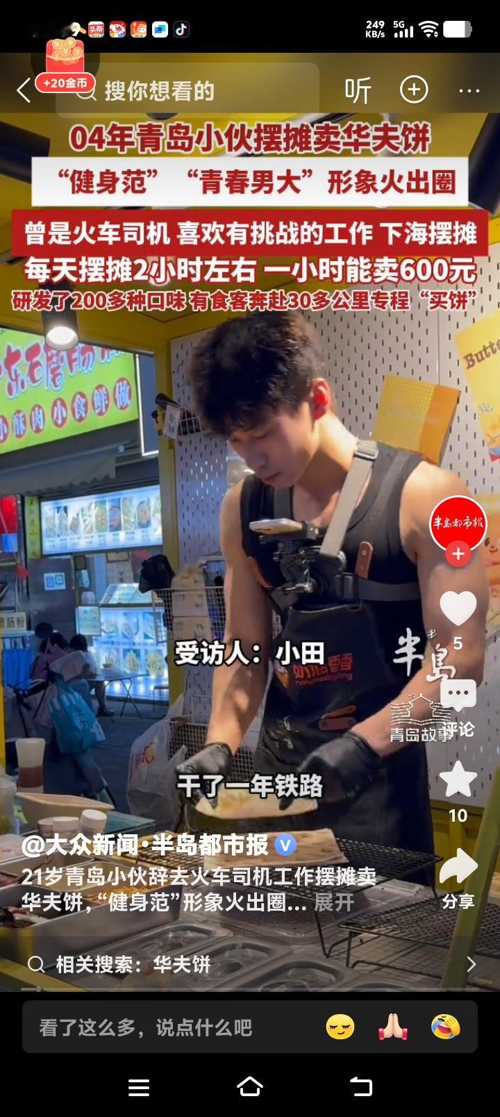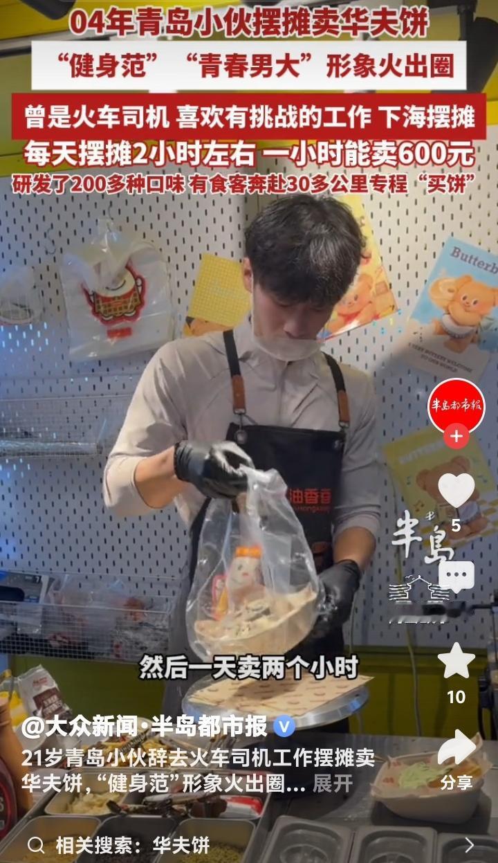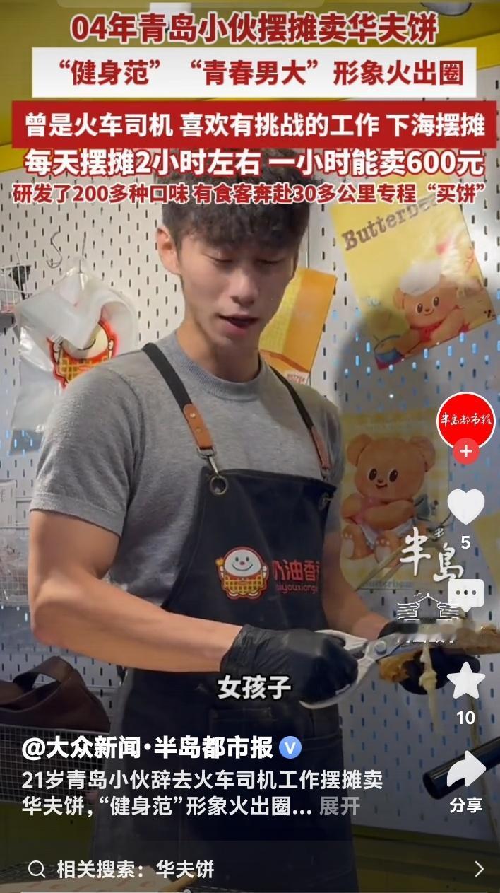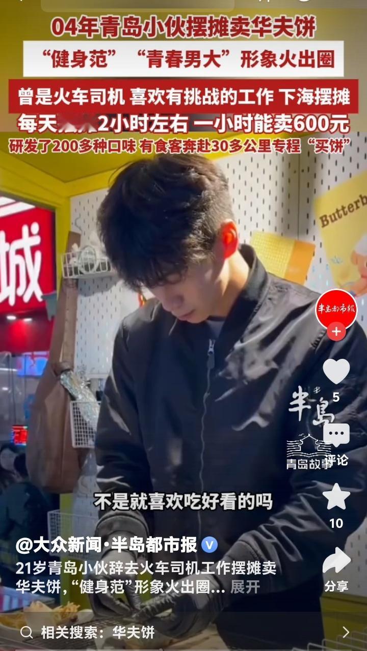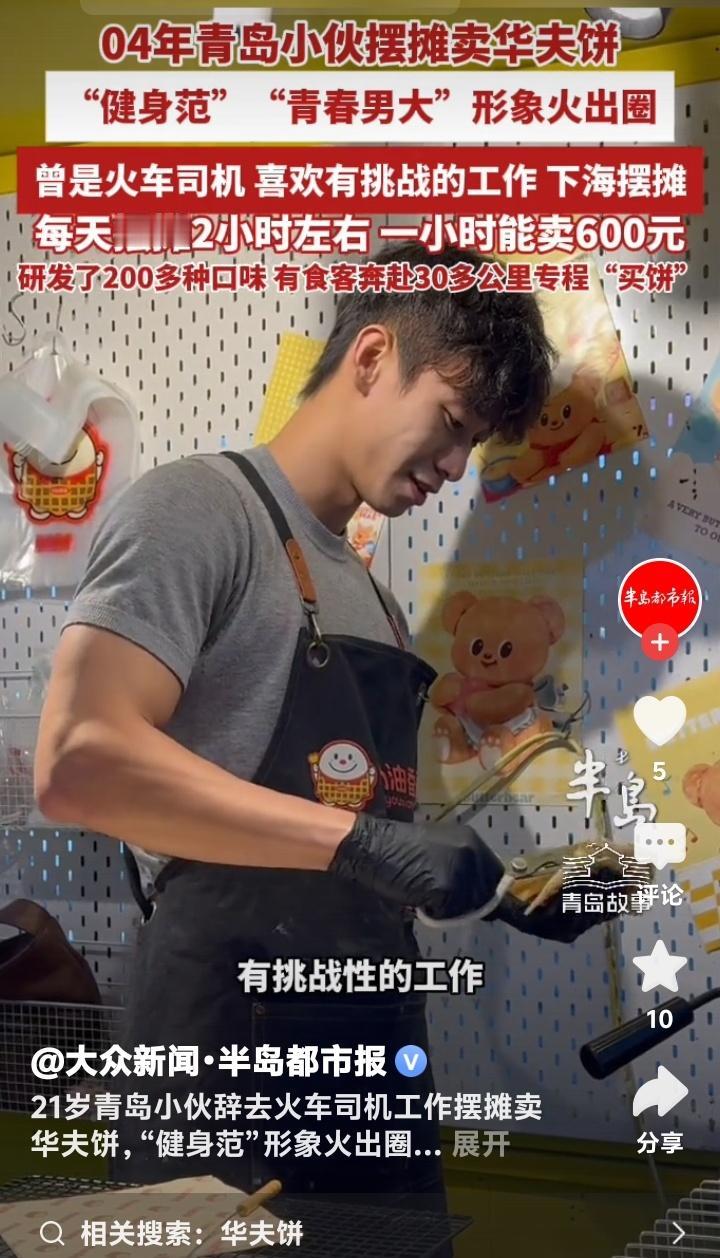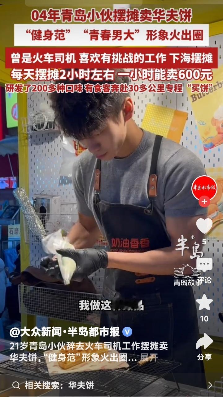 青岛台东夜市惊现“华夫饼男神”!04年肌肉小伙弃开火车摆摊,2小时狂赚1200,200种口味引食客跨城狂奔! 当夜幕降临青岛台东步行街,一个挂着暖黄串灯的小摊前排起长队。人群焦点不是网红奶茶,而是一位身穿黑色围裙、手臂线条清晰的年轻男孩。他叫小田,21岁,曾是一名火车司机,如今是夜市里传说般的存在——靠卖华夫饼,一小时收入600元,有人驱车30公里只为尝他做的饼。 很多人第一眼是被他的形象吸引。清爽的短发,健康的肤色,搅拌面糊时小臂隆起的肌肉线条,颠覆了人们对“摊贩”的刻板印象。有顾客偷偷拍下视频,配文“青岛最帅华夫饼小哥”,让他在短视频平台意外走红。但面对突然的关注,小田只是腼腆一笑,手上给华夫饼挤奶油的动作丝毫未慢。他说,自己以前在铁路上工作,生活规律却少了几分激情。 于是,这个喜欢挑战的年轻人决定“脱轨”。他辞去了稳定的工作,一头扎进厨房,开始研究华夫饼。从面粉配比到火候控制,从经典原味到创意迸发,他经历了无数次失败。厨房成了他的实验室,也成了健身后的另一个“训练场”。他说,精准控制烘烤时间,就像当年驾驶火车需要分秒不差。 功夫不负有心人。他最终研发出了超过两百种口味。除了经典的奶油草莓,还有芥末海苔、黑糖麻薯、甚至是融入青岛特色的“啤酒风味”华夫饼。每一款都是他反复调试的心血。正是这份极致,让他的小摊前总是围满食客。香气成了最好的招牌,口感成了最硬的口碑。 更让人惊叹的是他的效率与收益。每天下午五点半出摊,不到八点就能售罄。短短两个多小时,营业额常突破一千二百元。算下来,时薪远超许多白领。这不是简单的幸运,而是产品力、个人魅力与流量时代碰撞出的火花。他把摆摊,做成了一门精准高效的“精品生意”。 有年轻女孩坦言,一开始确实是冲着颜值来打卡。但尝过之后,却被他华夫饼外酥内软、创意十足的味道彻底征服,成了回头客。小田的故事,因此超越了简单的“颜值经济”。它更像一个隐喻:在这个时代,真正的“铁饭碗”不是某个岗位,而是把热爱做到极致的能力。 从驾驭钢铁巨龙到掌控小小烤盘,小田的转型让很多人思考。他放弃了外人眼中的稳定,选择了充满不确定性的热爱,并凭借专注与创新赢得了市场。他的身上,既有Z世代勇于打破常规的魄力,也有匠人精益求精的执着。这或许才是他真正“火出圈”的原因。 他的小摊,像一个温暖的驿站。为晚归的上班族提供甜蜜慰藉,为好奇的游客带来惊喜,也为无数观望的年轻人展示了一种可能:人生不止一条轨道,敢于驶向自己选择的方向,沿途的风景或许更加精彩。下一个路口,你会为自己的热爱踩下“油门”吗? (来源:根据半岛都市报、大众新闻及网络平台相关信息综合报道) 青岛身边事 青岛生活