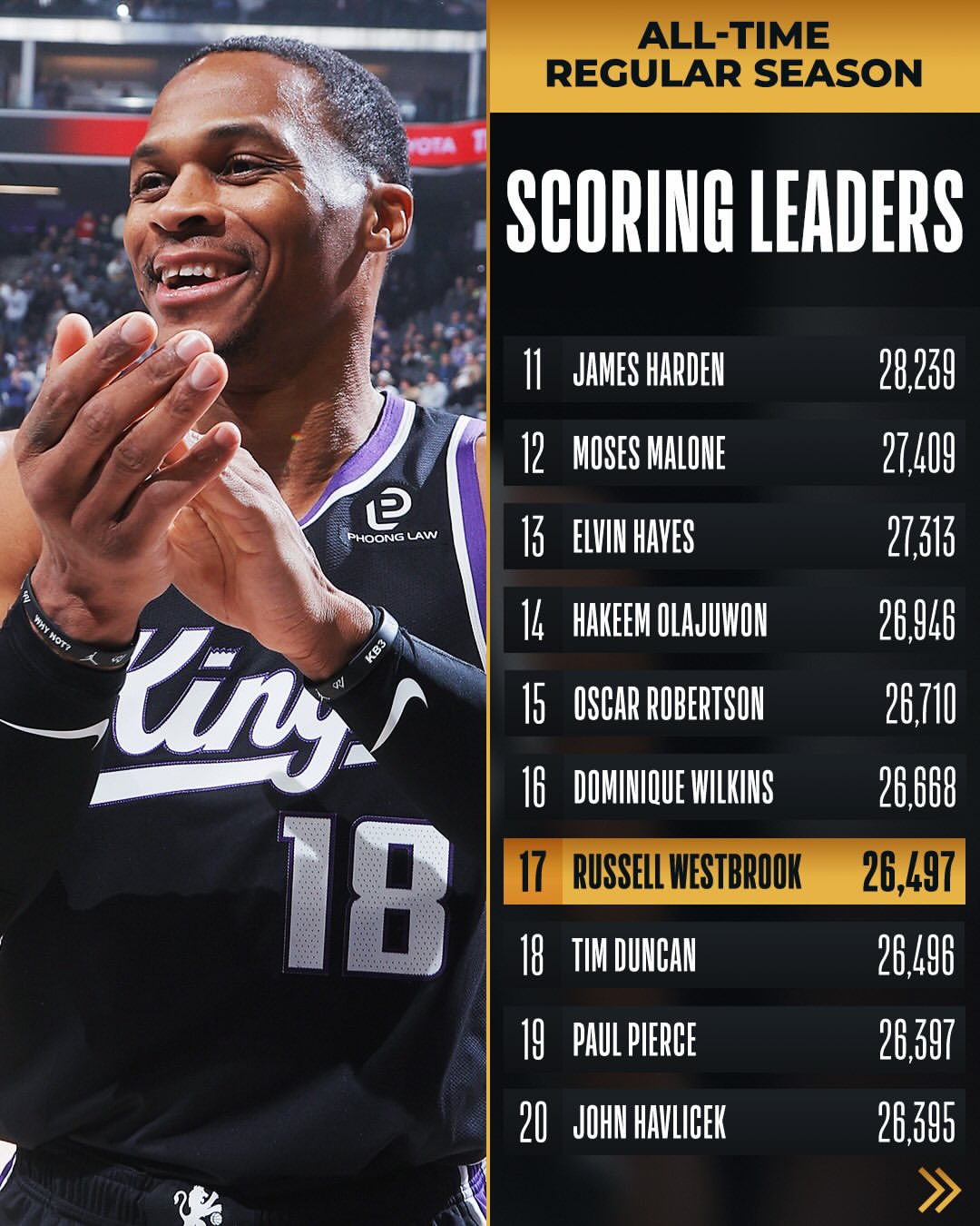 拉塞尔-威斯布鲁克在历史得分榜超过蒂姆-邓肯,升值第十七位。