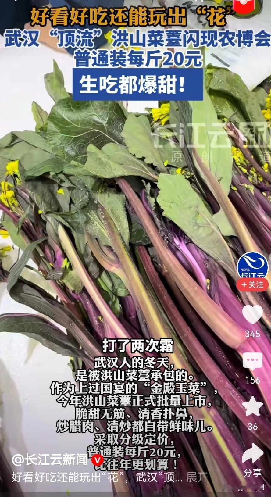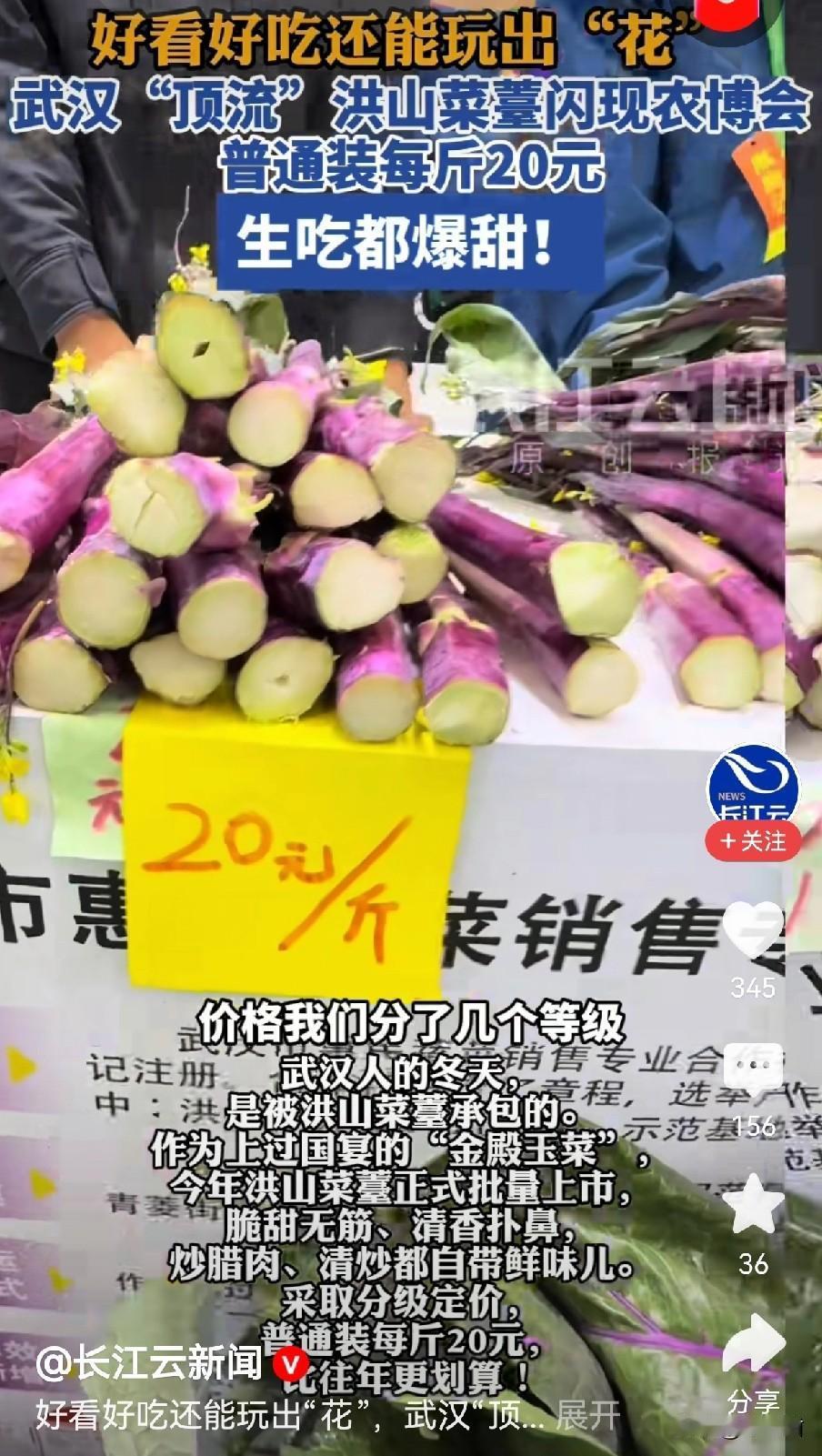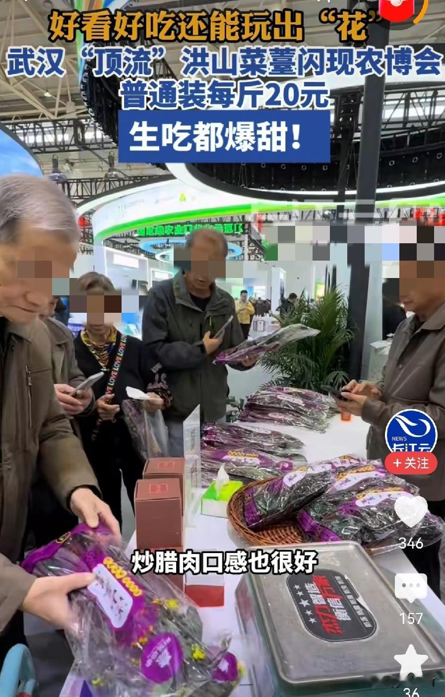 武汉人是没见过这把蔬菜吗,我们四川叫红油菜,价格在7.8块一斤,最低的时候2块一把。结果在农博会上,居然炒出了60块/斤的天价。 普普通通的蔬菜,随便一清炒都好吃,还以为这价格是到了大上海饭店的隔壁,结果在武汉的农博会都开始这么忽悠了。 宣传工作人自信满满的推销着这款蔬菜,以至于我都回头看了好几次,生怕我眼睛看花了,这么普通的蔬菜,几块钱一斤随处可买的,加了个普通的包装就敢卖到20元—60元/斤。 看到很多顾客纷纷掏出手机买单,果然有钱人的钱真好赚啊,还是菜市场去少了啊。说什么20的便宜,纤维多一点,不就是我们喊的菜老了吗?60块的没有无筋脆甜,那就是嫩点而已。换做是你,会买这60一斤的红油菜吗? (图片来自网络视频)