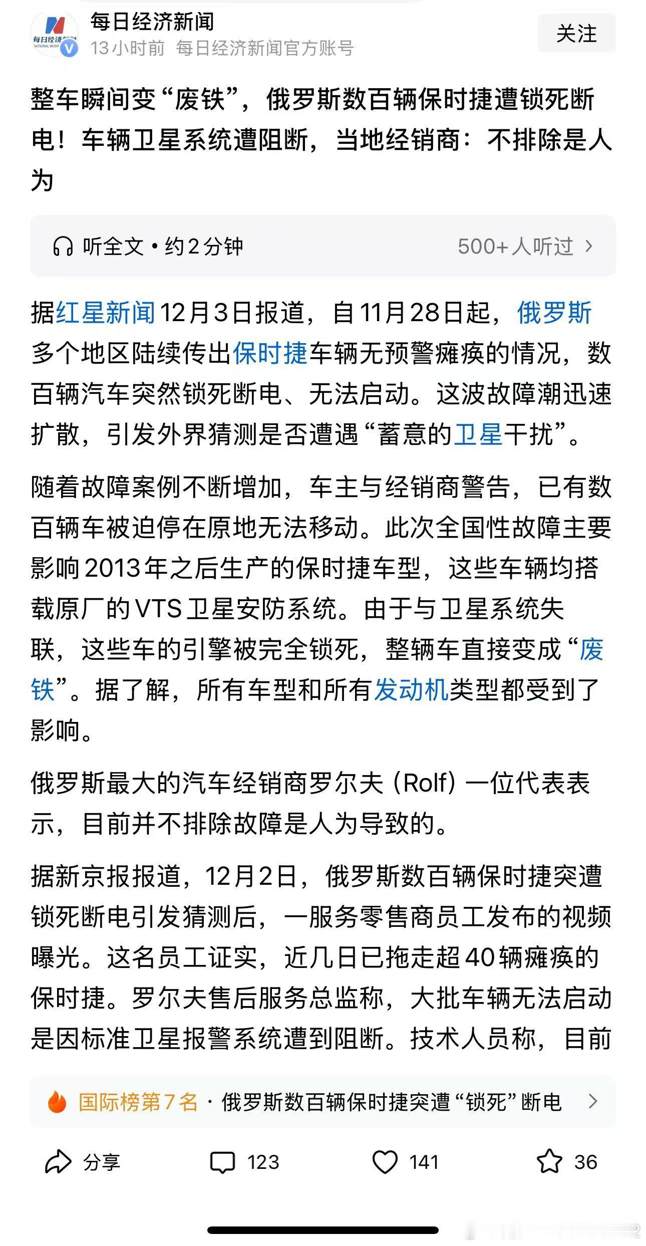 据红星新闻12月3日报道,自11月28日起,俄罗斯多个地区陆续传出保时捷车辆无预警瘫痪的情况,数百辆汽车突然锁死断电、无法启动。这波故障潮迅速扩散,引发外界猜测是否遭遇“蓄意的卫星干扰”。随着故障案例不断增加,车主与经销商警告,已有数百辆车被迫停在原地无法移动。此次全国性故障主要影响2013年之后生产的保时捷车型,这些车辆均搭载原厂的VTS卫星安防系统。由于与卫星系统失联,这些车的引擎被完全锁死,整辆车直接变成“废铁”。据了解,所有车型和所有发动机类型都受到了影响。俄罗斯最大的汽车经销商罗尔夫(Rolf)一位代表表示,目前并不排除故障是人为导致的