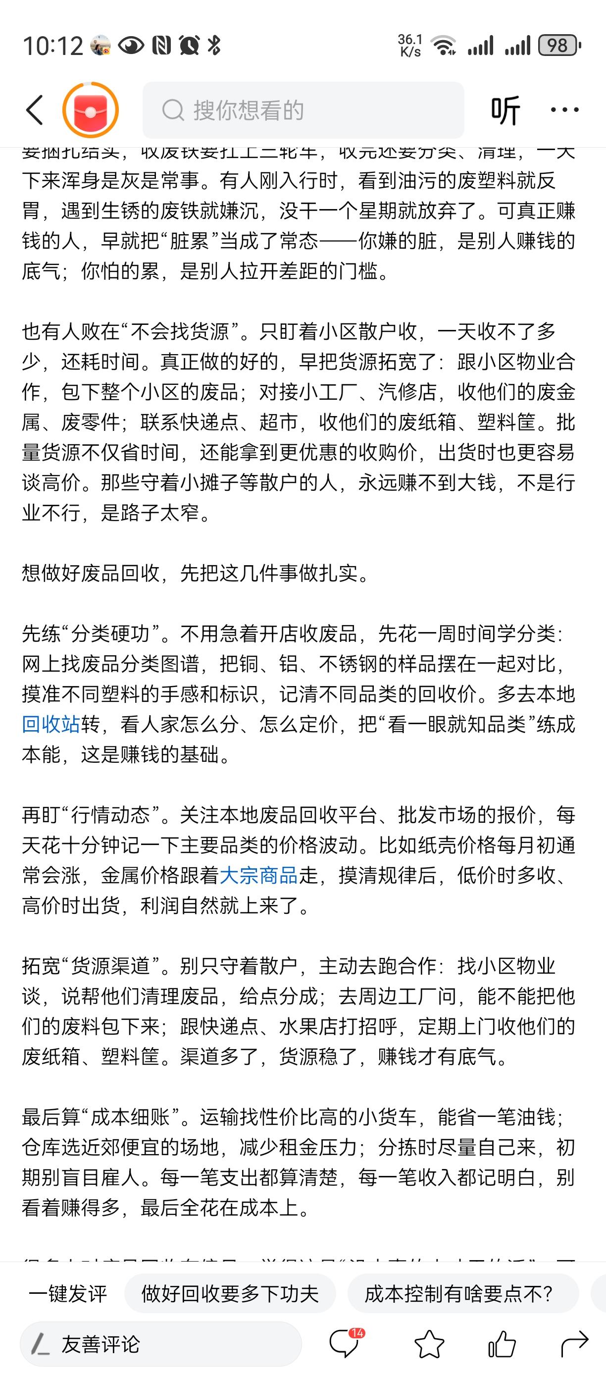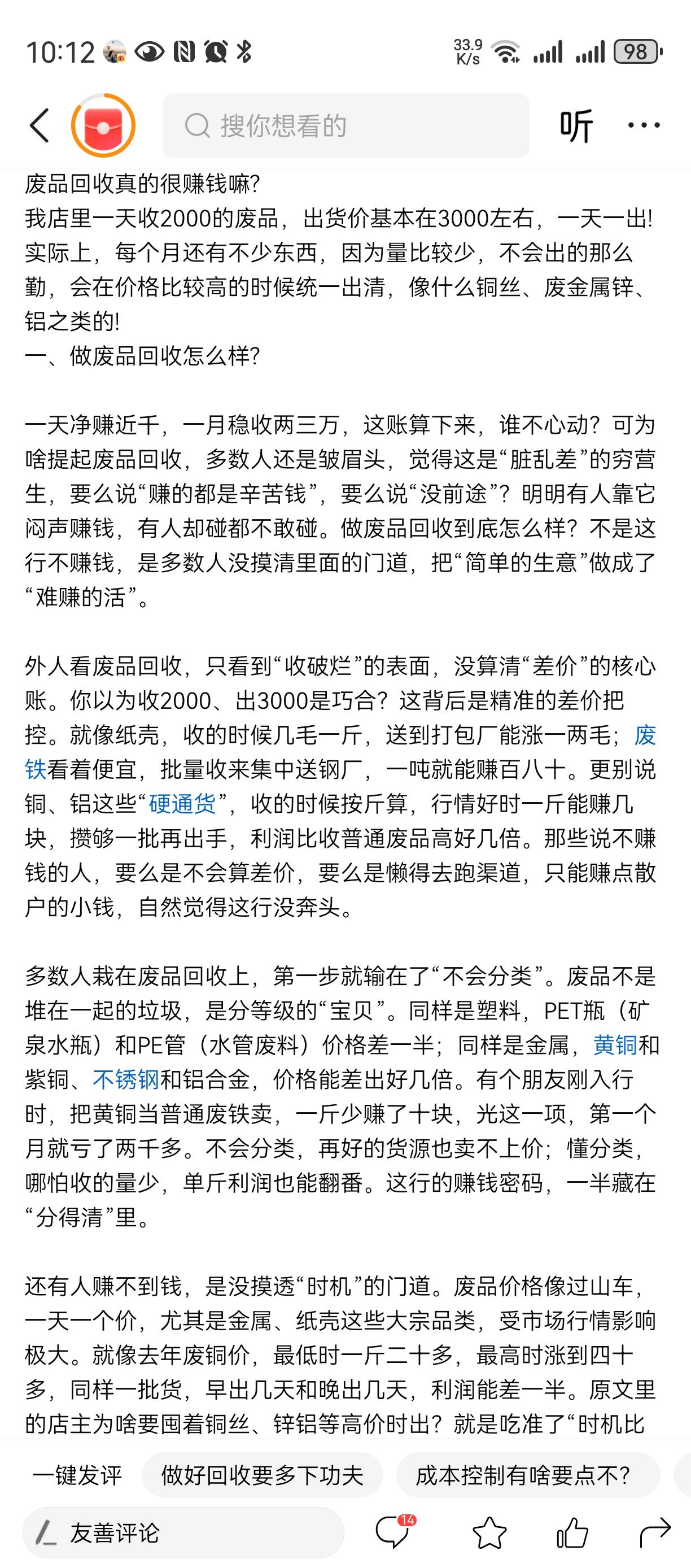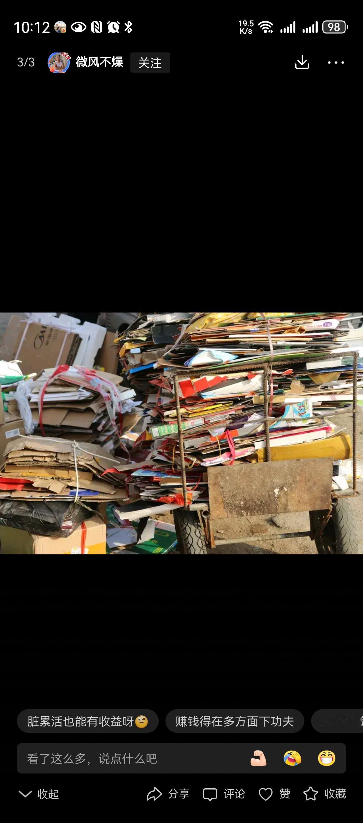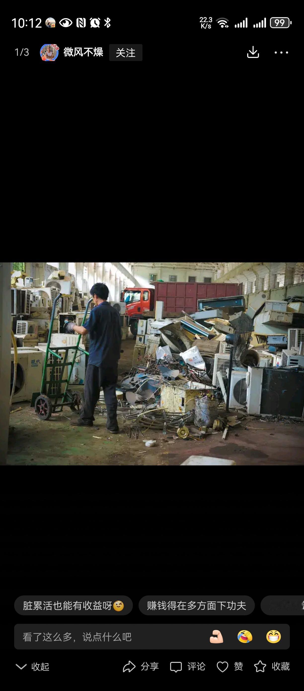 行行出富豪(废品老板) 我认识一个熟人, 干的是收废品。 不但自己收, 还把他读初高中的女儿儿子全带入行。 不要看开的是破皮卡, 自己另外开的确实奔驰。。。 说年入轻轻松松七位数(100+W) 但是你没有这个渠道, 没有办法做这行生意的[呲牙]废品利润 废品收购者