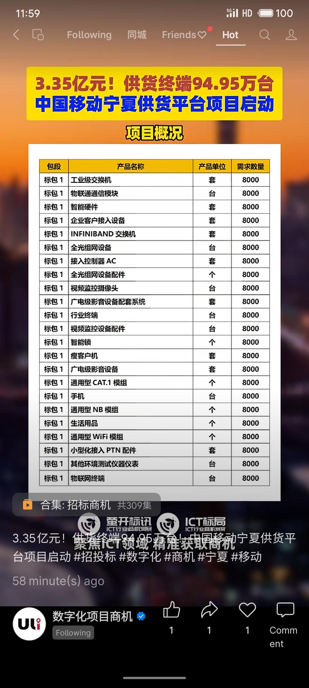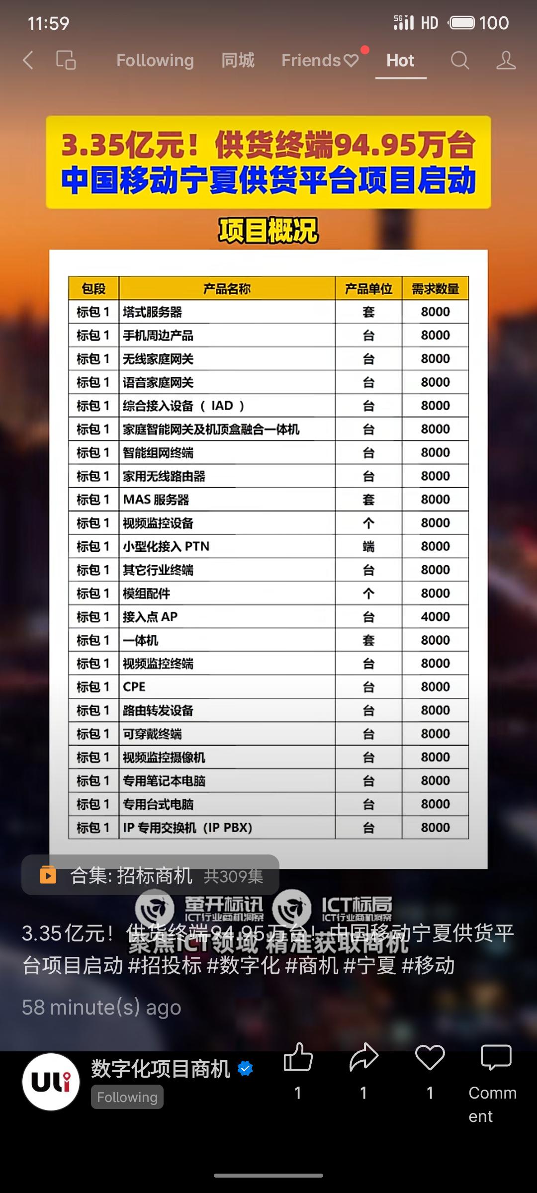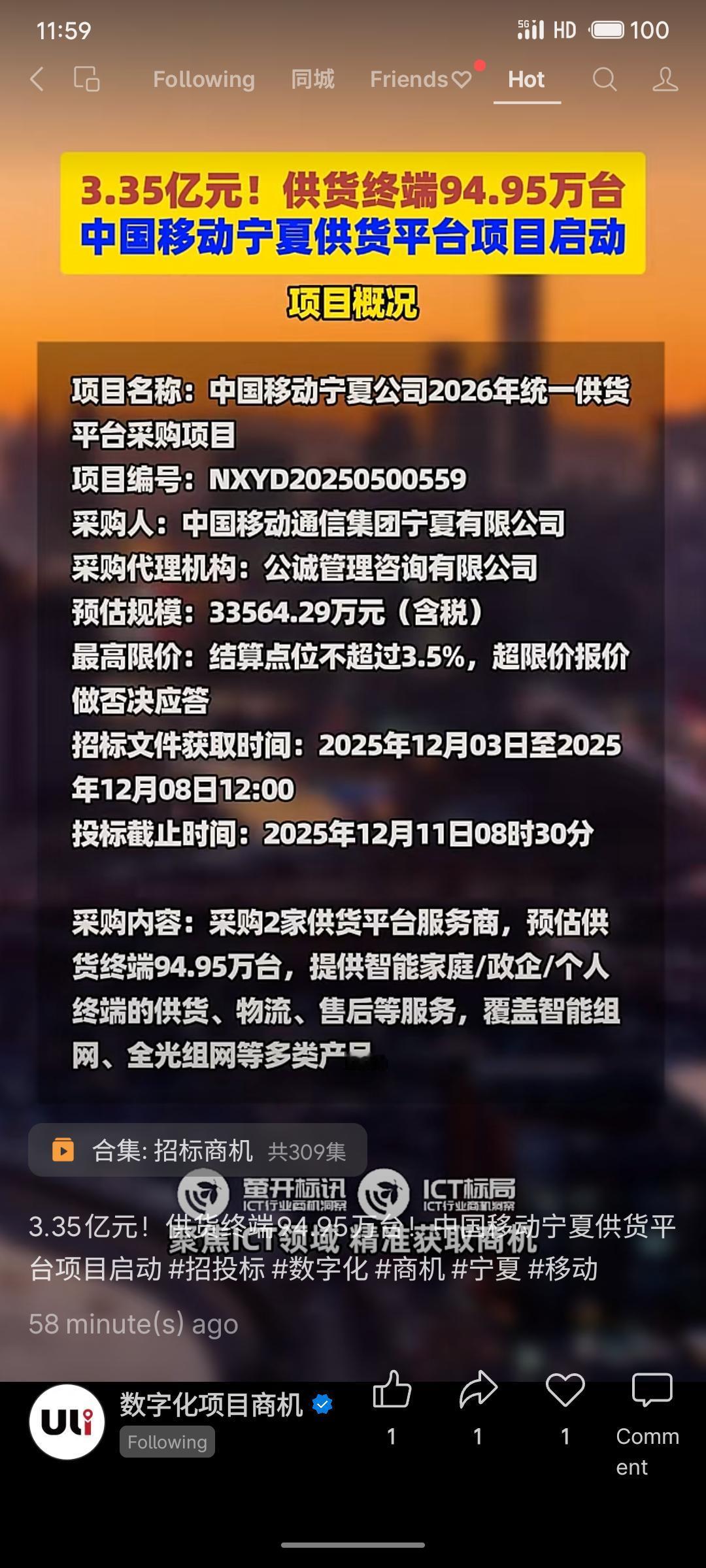中国移动宁夏公司启动2026年统一供货平台采购项目,预算约3.35亿元。项目旨在采购两家服务商,为智能家庭、政企及个人客户提供终端产品供货、物流与售后全链条服务,预估供货终端总量达94.95万台,涵盖网络设备、智能硬件、行业终端等多类产品。