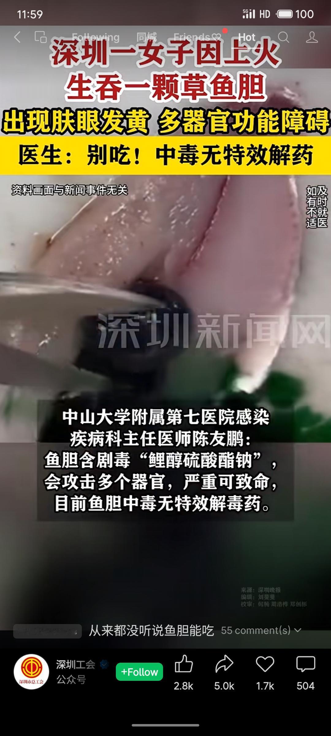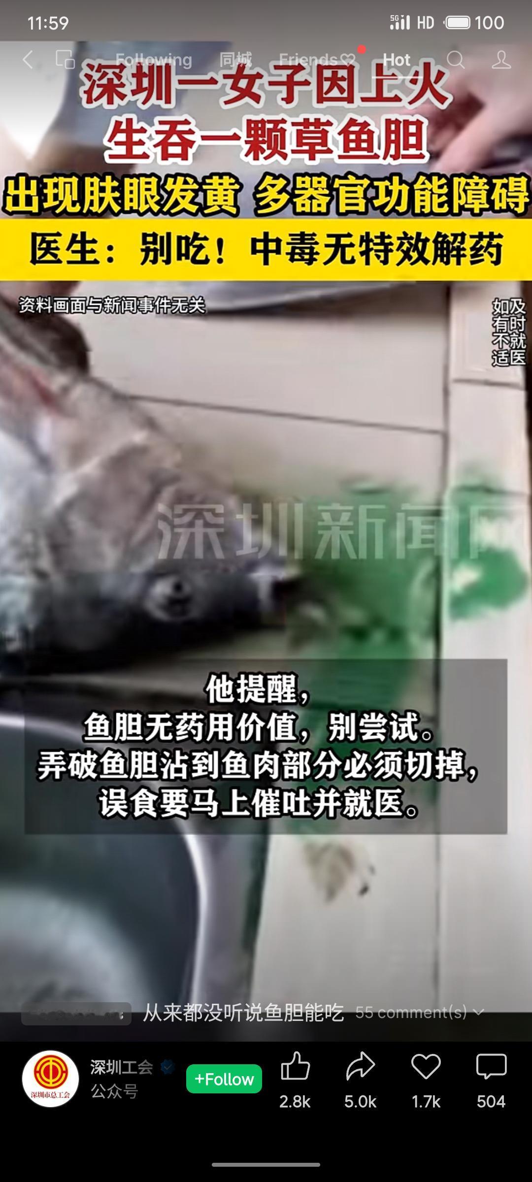 深圳一女子因听信“鱼胆清火”偏方,生吞草鱼胆后中毒,导致急性肝衰竭及多器官功能障碍。医生紧急提醒,鱼胆含剧毒物质“鳃醇硫酸酯钠”,无药用价值且中毒后无特效解药。此事再次警示公众勿信民间偏方,处理鱼胆时需格外谨慎。