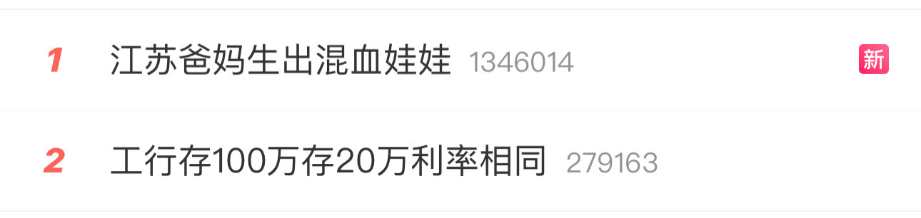 媒体这真的是流量恐慌啊疯狂的用热搜第一和热搜第二给自己的其他微博增加流量数据不想着好好做内容光想着流量了江苏爸妈生出混血娃娃工行存100万存20万利率相同热点观点 江苏爸妈生出混血娃娃