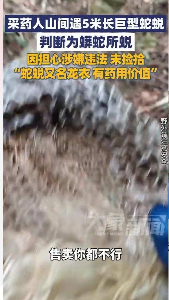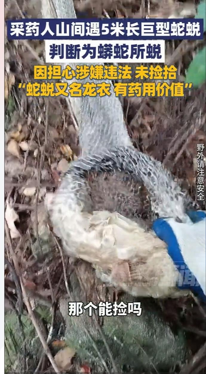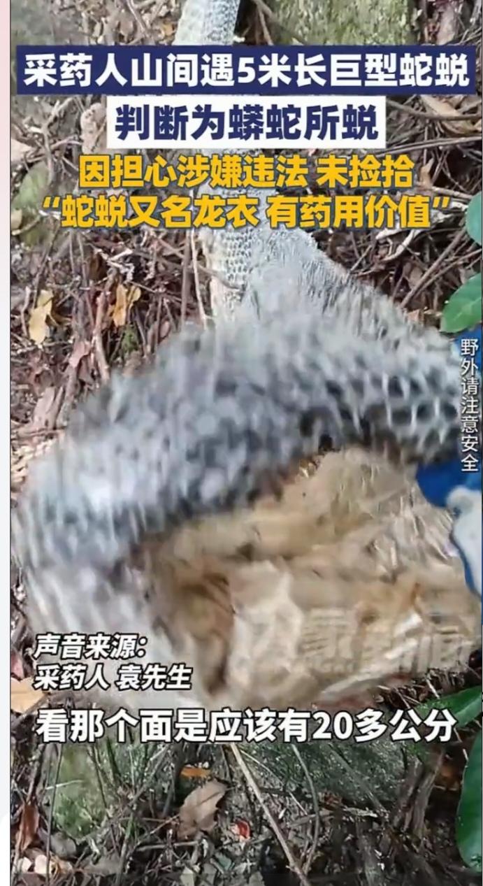 广东阳江深山惊现5米巨型蛇蜕!采药人目睹"龙衣"不敢捡 广东阳江一处人迹罕至的深山密林中,采药人袁先生近日遭遇了毕生难忘的一幕:在一处背阴的岩缝旁,一张巨型蛇蜕横卧草丛,展开后长达5米,最粗处堪比成年人小腿,银灰色的背鳞带着金属光泽,腹部乳白色的鳞片呈覆瓦状排列,轻轻一碰还能感受到柔韧的弹性,搓揉时发出沙沙声响 。 有着二十余年采药经验的袁先生当场惊出冷汗,他判断这是国家一级保护动物蟒蛇蜕下的"龙衣",如此体量的蛇蜕实属罕见。"蛇蜕前端的头部轮廓清晰,鳞片纹路完整,应该刚蜕下没多久。"袁先生本想捡拾,却突然想起相关法律规定,最终只能拍照留念后匆匆离开,生怕触犯法律红线。 这张巨型蛇蜕在中医里被称为"龙衣",药用价值极高,能祛风定惊、解毒止痒,还可用于治疗目生翳障、皮肤湿疹等病症,《本草纲目》中早有其主治"小儿惊痫、肠痔疟疾"的记载。但因来源多涉及保护蛇类,私自收购、出售均属违法,浙江曾有人因此获刑三年。 照片传到网上后瞬间引发热议:"5米蛇蜕对应本体得多大?想想就腿软!"有网友惊叹;也有网友点赞袁先生:"生态保护意识在线,这才是理智选择";还有人好奇:"这么珍贵的药材白白留在山里,有没有两全其美的办法?"更有两广网友分享类似经历,称曾见过胳膊粗的"过山峰"蛇蜕,年年都在变大。 这张静静躺在深山的蛇蜕,既见证了生态环境的改善,也抛出了保护与利用的思考题:如何在守护野生动物的同时,兼顾传统医药资源的合理利用?你对此有何看法?广东蟒蛇 广东房屋大蟒蛇 南京蛇蜕 蛇蜕成龙