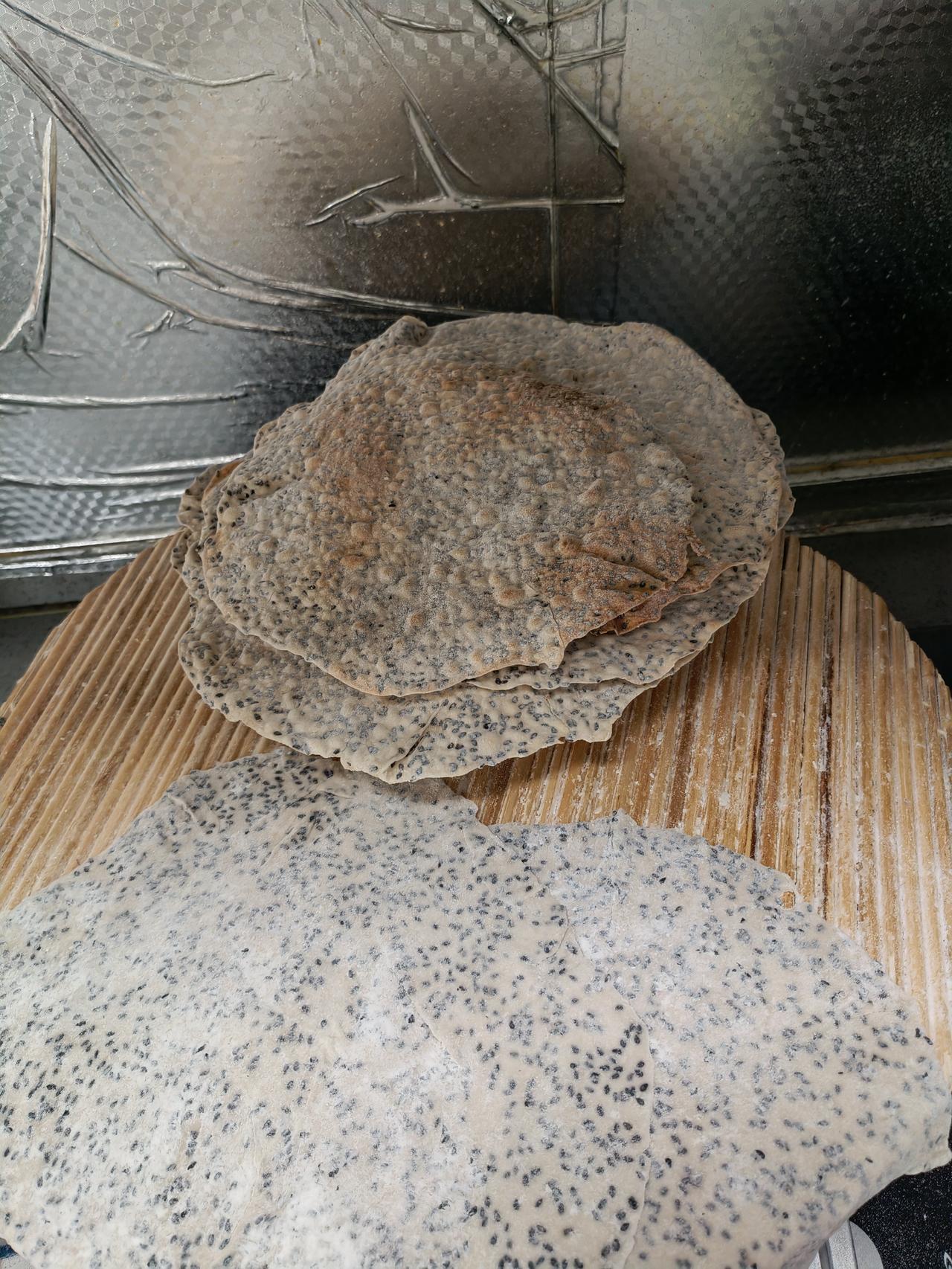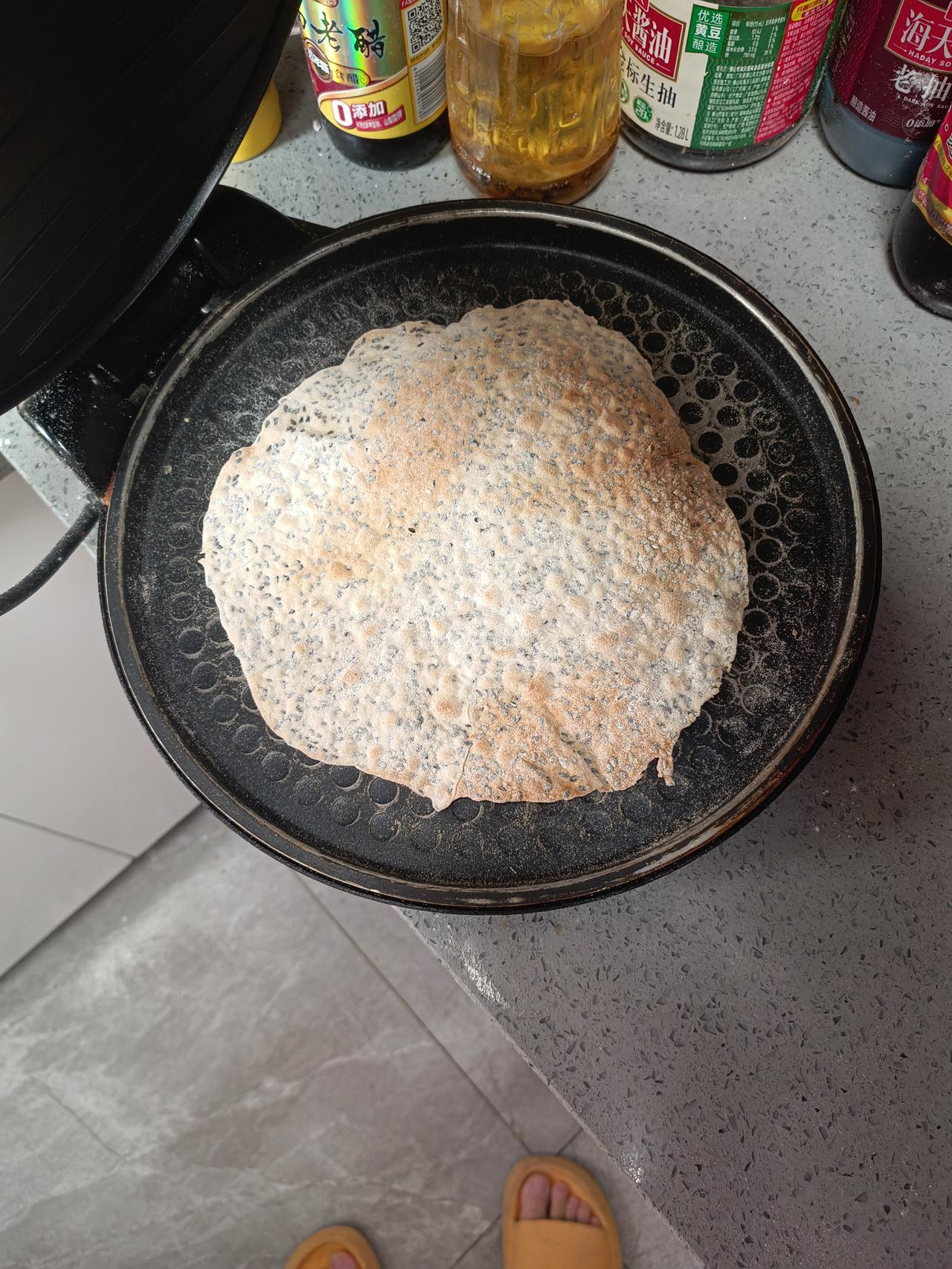 甲流第4天女儿夜里吃了一次退烧药,高烧总算退掉了。 就是不吃饭,吃点东西就想吐。 没办法!我只能拿出我祖传好几代的手艺,也是河南特色烙“焦馍” 养胃易消化。 家里没有白芝麻了,就剩一点黑芝麻,当然用黑芝麻也行。 说干就干,温水和面,加一点盐和黑芝麻,“面剂子”揉好放在那里“醒”个十分钟。 从橱柜里拿出电饼铛,插上电插,开始擀焦馍,焦馍擀的越薄越好,比纸张厚一点就可以了。 擀好薄面饼放在电饼铛里,正反两面煎2分钟左右,焦馍泛黄就可以拿出来了。 今天做了10多张,够孩子吃好几天的了。 做好了,就这样一张一张的,放凉后就会酥脆,吃在嘴里微微有点咸味就可以了。 吃不完的拿个塑料袋,装起来以免回潮。 我记得小时候姥姥和奶奶都做过这样的焦馍。 河南特色,鸡蛋茶、焦馍。 一个帮助消化,一个下火养胃。 冬季里开暖气,室内干燥上火。 喝一个鸡蛋茶,可以缓解内热。 鸡蛋茶的做法:拿一个鸡蛋,放在碗里打散,放一点盐,拿烧开水一冲,再倒一点芝麻油,就可以喝了。 喜欢喝甜口的放白糖或红糖都可以。 记得以前孩子不舒服,我就会拿出祖传手艺,做焦馍,孩子没吃多少,最后都被老公打扫了。 他一边看着手机,一遍吃着焦馍,最后吃的连个渣都不剩。