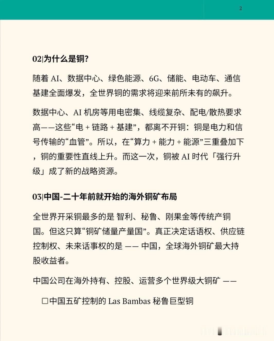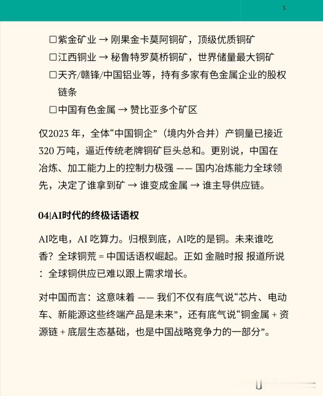 AI吃铜,可铜矿怎么又在中国手里 英国 金融时报 最新报道指出,AI 服务器与数据中心正在推高全球对铜的需求,而英伟达等科技巨头正成为“最大吃铜户”。 与此同时,报道也提到:全球关键铜矿的权益分布中,中国企业凭借十多年前的提前布局,正成为这波“AI 铜浪潮”的主要受益者。