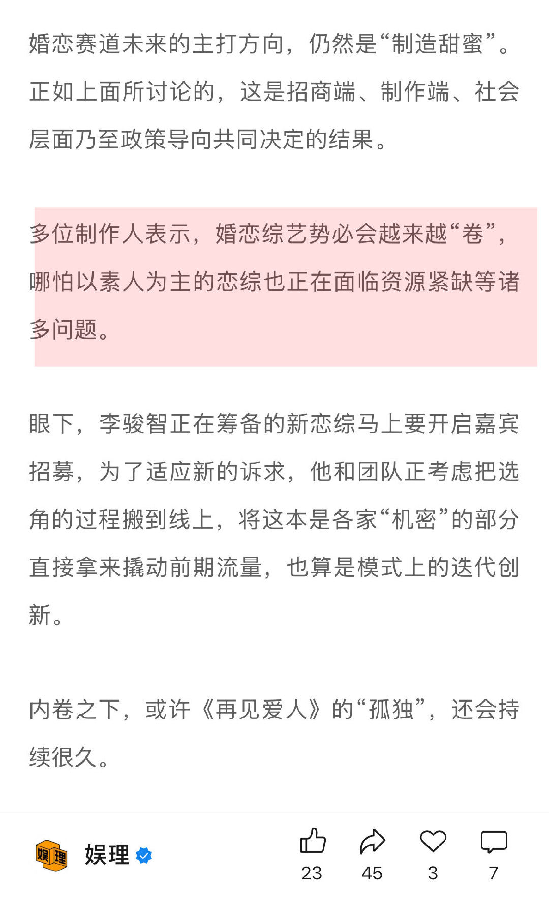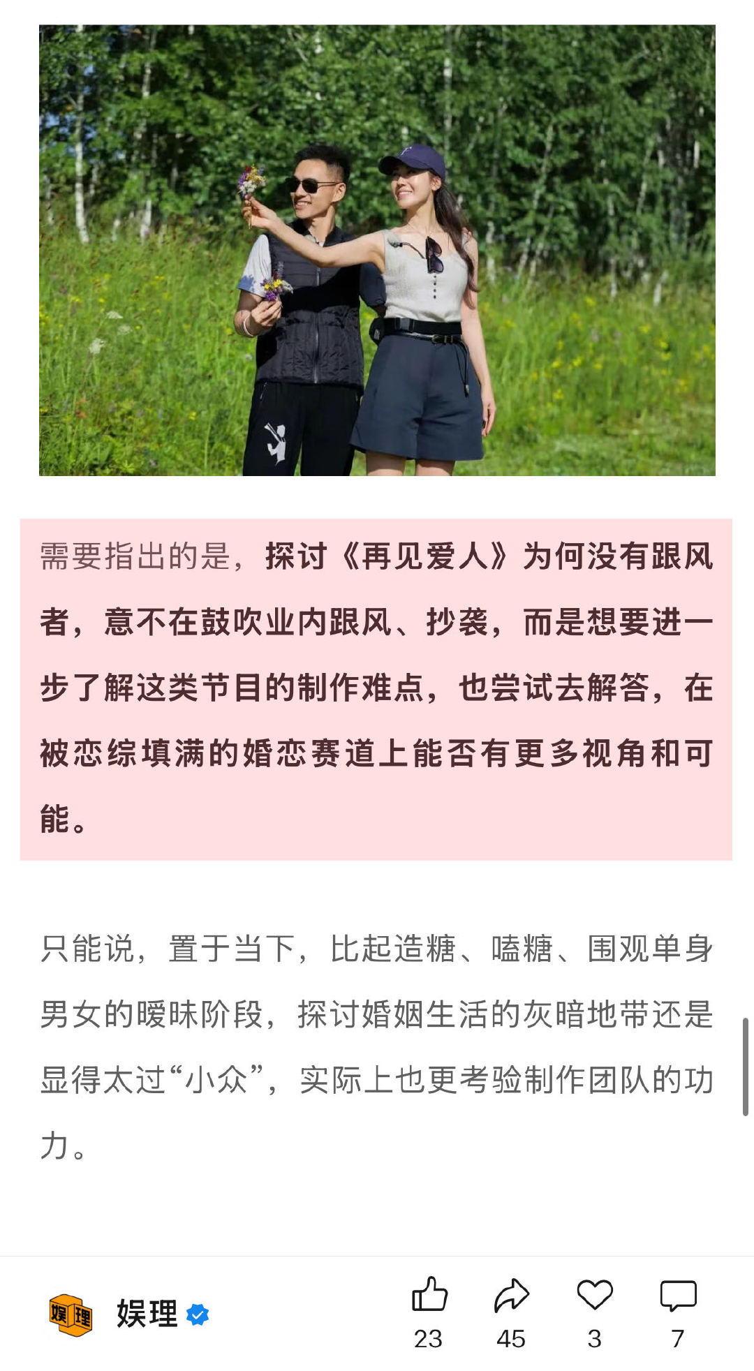 品牌方觉得离婚这事儿晦气 业内谈离婚综艺招商难 探讨《再见爱人》为何没有跟风者,意不在鼓吹业内跟风、抄袭,而是想要进一步了解这类节目的制作难点,也尝试去解答,在被恋综填满的婚恋赛道上能否有更多视角和可能。只能说,置于当下,比起造糖、嗑糖、围观单身男女的暧昧阶段,探讨婚姻生活的灰暗地带还是显得太过“小众”,实际上也更考验制作团队的功力…娱理独家↓
