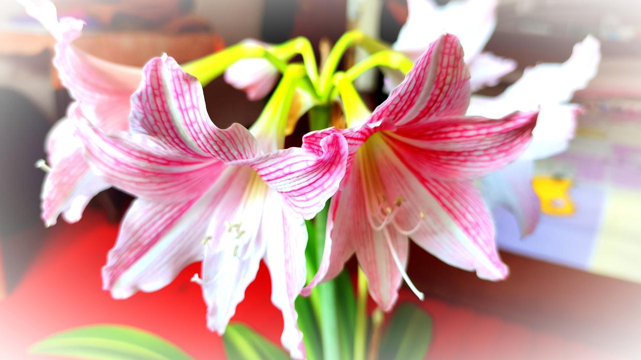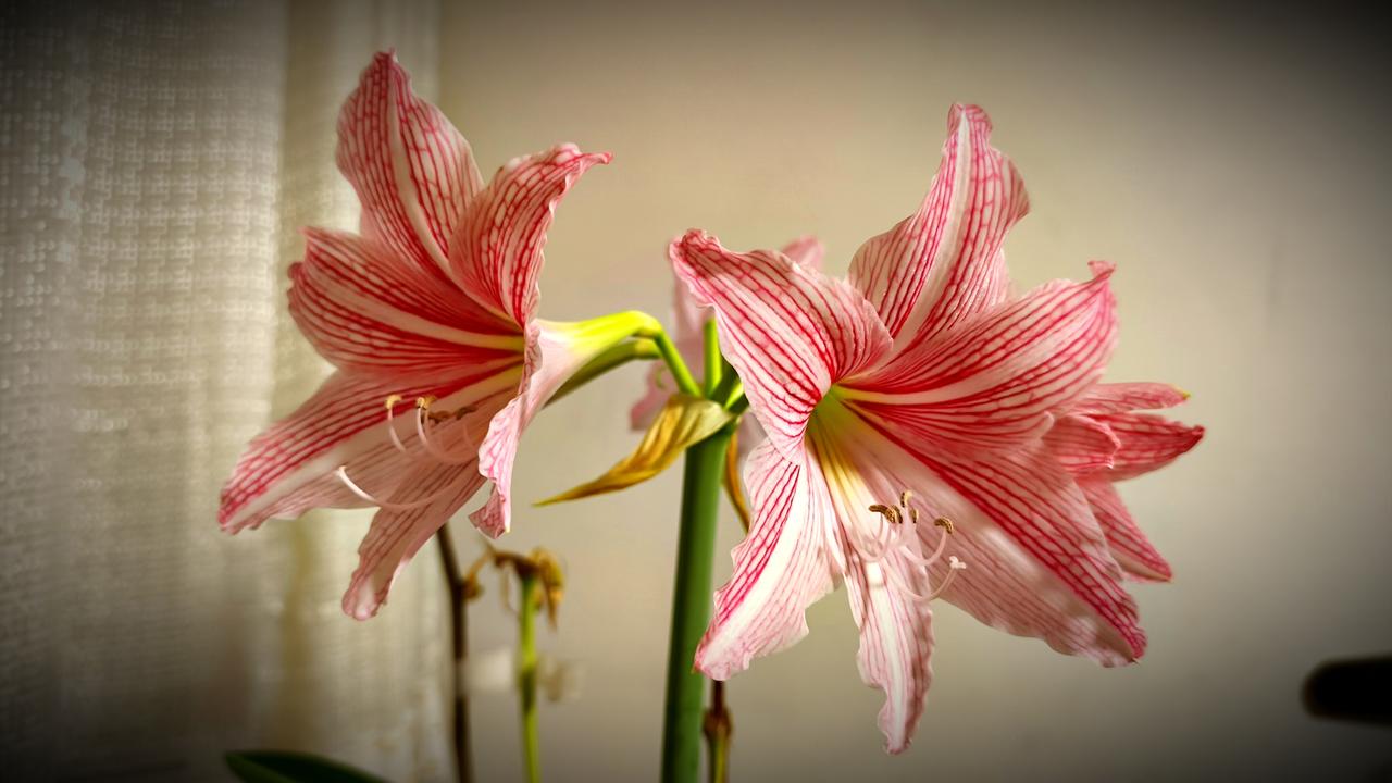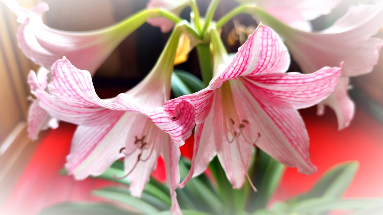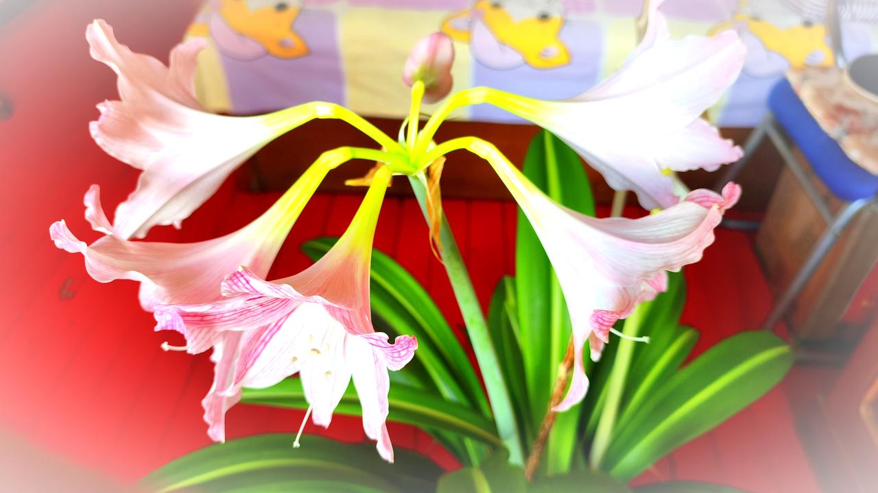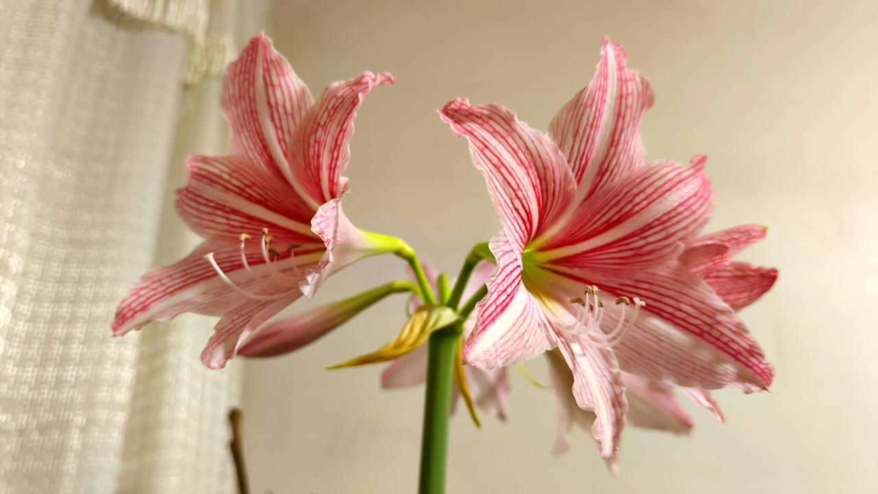 朱顶红(学名:Hippeastrum rutilum),石蒜科朱顶红属多年生草本植物,原产南美洲,现作为观赏花卉广泛栽培。花型硕大、色彩艳丽,是常见室内盆栽和园林绿化植物。 形态特征 ‌花朵‌:花茎中空,顶端着生2-6朵花,花瓣6片,边缘波浪状,粉白相间条纹,花心黄色,花型舒展优雅。 ‌叶片‌:带状,绿色有光泽,从鳞茎基部抽出,与花茎同期或稍后生长。 ‌鳞茎‌:地下球形鳞茎,外皮褐色,是储存养分和繁殖的重要器官。 生长习性 ‌光照‌:喜温暖湿润、阳光充足环境,夏季需遮阴,冬季可全日照。 ‌土壤‌:偏好疏松肥沃、排水良好的微酸性土壤(如腐叶土+园土+河沙混合基质)。 ‌花期‌:自然花期春季至初夏,养护得当可秋季再次开花(如图中晚秋开花状态)。 观赏与养护价值 朱顶红因花色丰富(红、粉、白、复色等)、花量大,常用于庭院装饰、阳台盆栽或切花。鳞茎繁殖能力强,养护简单,适合园艺新手。若需了解具体养护技巧(如浇水频率、施肥方法等),可进一步提问。