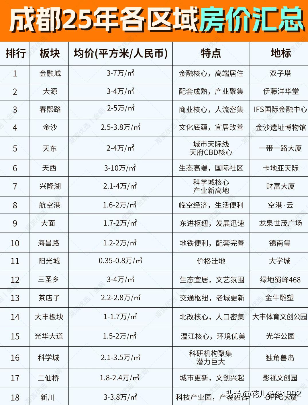 卷到离谱,成都人眼中的区域排名,真实。 每个区的“人设”都被拿捏得死死的 1. 高新区 · 新成都人首选地。 · 金融城、软件园打造「西部硅谷」 · 国际范与快节奏的摩登交响 2. 锦江区 · 老牌繁华腹地 · 春熙路太古里引领时尚浪潮 · 千年濯锦之江与都市霓虹共舞 3. 青羊区 · 文脉深处藏富庶 · 金沙遗址与宽窄巷子对话千年 · 学区房价值与慢生活兼得 4. 武侯区 · 南富云集的宜居标杆 · 桐梓林玉林烟火与高端社区并存 · 「三国文化+小酒馆」双IP承载地 5. 成华区 · 主城价值洼地正蜕变 · 东郊记忆扛起文创复兴旗帜 · 熊猫基地与建设路夜市共绘新生 6. 金牛区 · 北改核心动能充沛 · 荷花池商贸城迭代时尚中心 · 轨道交通枢纽链接成德绵 7. 天府新区 · 未来城市新中心 · 兴隆湖科学城引聚高知人群 · 公园城市理念的极致实践场 8. 双流区 · 空港经济驱动生活升级 · 大学城与国际航线共筑年轻力 9. 龙泉驿区 · 东进桥头堡迎发展浪潮 · 桃花故里与汽车城产城融合 · 大运主场馆激活城市新界面 10. 温江区 · 西控下的宜居典范 · 大学城滋养温润生活气息 11. 新都区 · 北改红利持续释放 · 家具产业与地铁3号线助推焕新 12. 郫都区 · 科创商务区聚集潜力 · 电子信息与田园交错共生 13. 青白江区 · 国际铁路港带动转型 · 老工业区蜕变开放前沿 14. 简阳市 · 东部新区主战场 · 天府国际机场重塑区域格局 15. 都江堰市 · 世遗生态康养圣地 · 拜水问道与熊猫谷自然疗愈 · 成都人周末放松首选地 16. 彭州市 · 龙门山民宿集群崛起 · 蔬香田野承载田园梦想