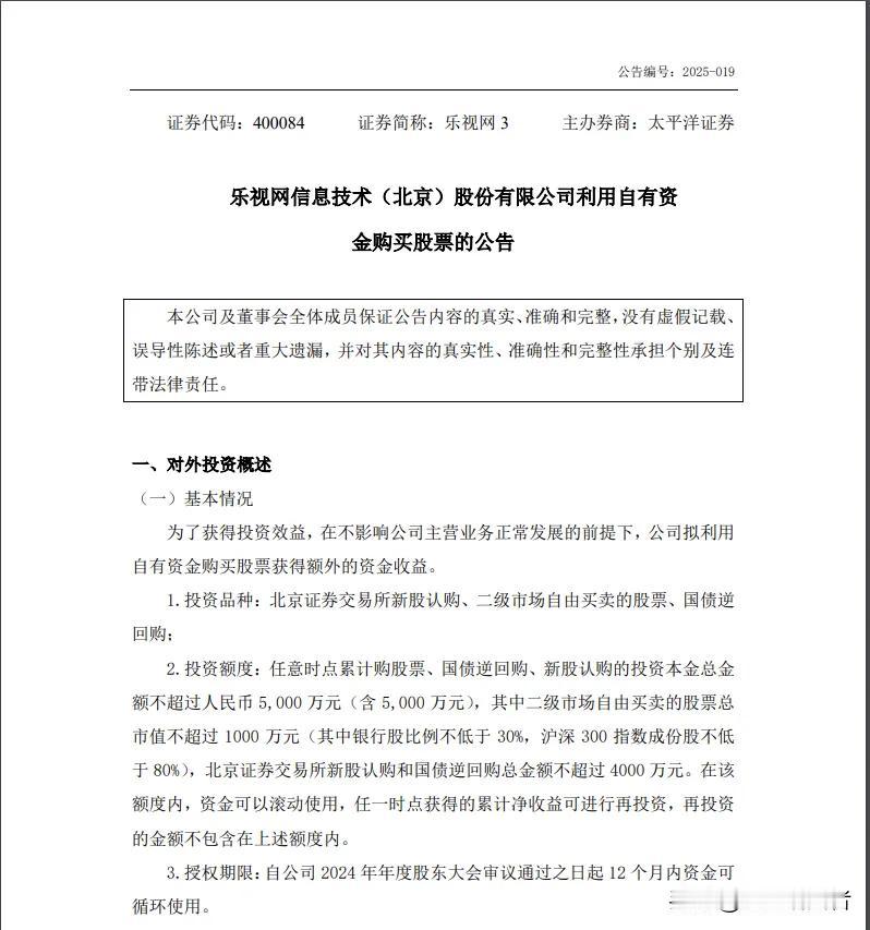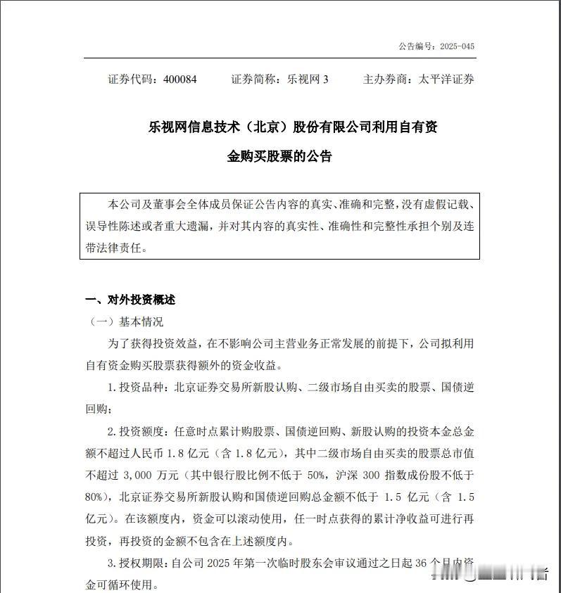 【魔幻!负债237亿的乐视,竟拿出1.8亿“炒股”】 已退市的乐视网再出惊人操作!12月2日,公司公告将炒股资金额度从4月的5000万大幅提升至1.8亿元,并公布详细规划:3000万投A股(银行股占一半以上),1.5亿用于北交所打新和国债逆回购。 然而反差巨大的是,乐视网2024年负债总额已高达237.63亿元,资产却仅18.55亿元,资不抵债悬殊。一边是巨额债务未解,一边是重金投入股市,这波操作引发市场强烈关注。 有观点认为,此举或是公司在主业停滞背景下试图“搏一把”改善现金流;但也有投资者直言,这更像是“刀口舔血”,风险极高。 负债累累却豪掷近2亿炒股,你看好乐视这番投资计划吗?这是绝地求生还是又一危险游戏? 欢迎评论区留下你的看法!
