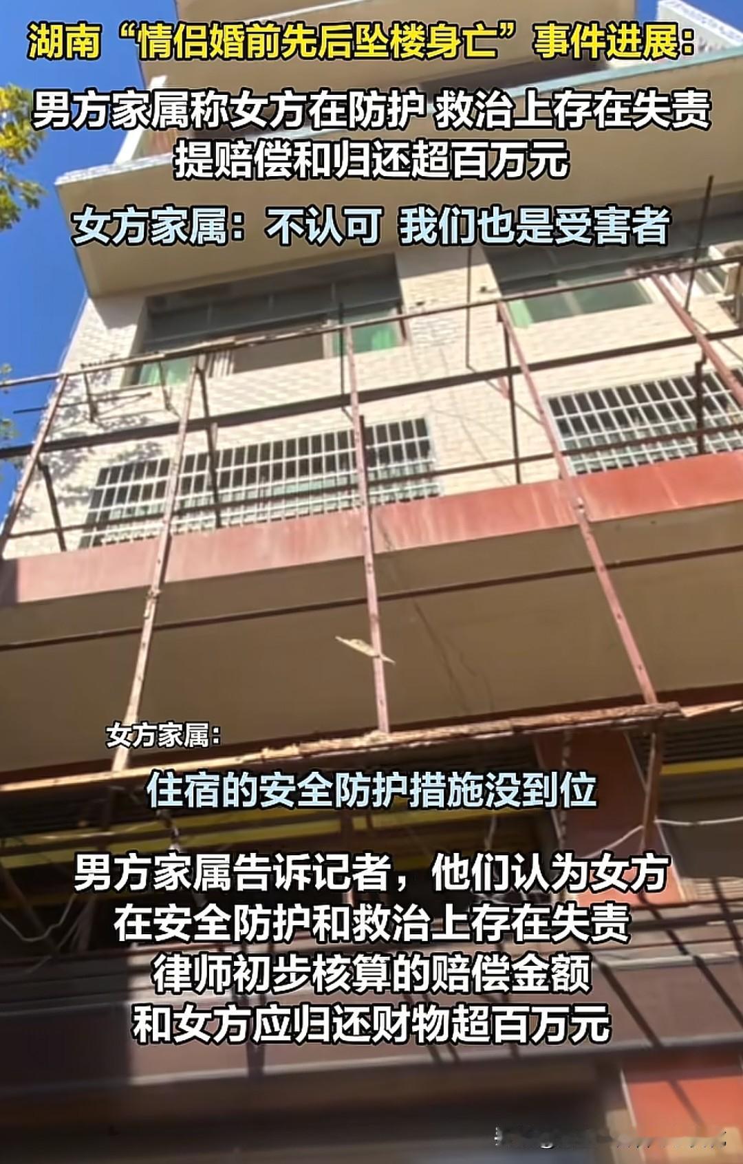 本来是亲家,现在是仇家。湖南一对情侣纷纷坠楼,新郎是意外坠楼,新娘是殉情,两家人现在闹上了官司,男方家属要求女方赔偿所有损失超157万!对方则表示自己也是受害者,自家的孩子也没了,不应该赔偿。 新郎为什么会在新娘家坠楼,新娘又为什么殉情,有时看似意外,其实是人祸。新郎意外坠楼,女方父母并没有第一时间进行抢救,也没有通知新娘,错过了很多宝贵的机会。如果是觉得新郎摔成残疾,怕影响女儿婚后生活,见死不救,需要担责。如果这样去想,大家就能理解新娘的极端行为了。 不过要注意的是,157万是所有损失,里面包括了彩礼、筹备婚礼等所有的费用,几乎把所有花出去的钱算进去了,这一切都让女方家属承担。所以整件事新娘一家是最倒霉的,不仅人财两空,得不到任何赔偿,还要赔钱给男方,实属晦气。 在面对意外,一定要尽心尽力,不要顾虑太多,做到问心无愧,或许奇迹会发生,一切会慢慢好起来。如果犹豫了,很多麻烦就会接踵而至。