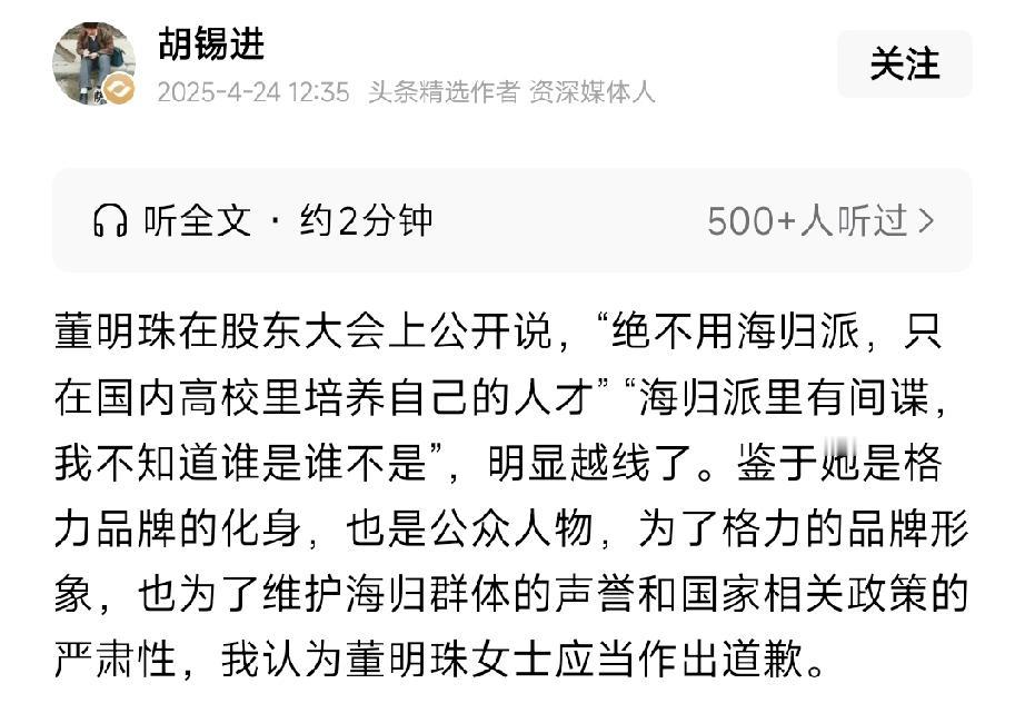 董大姐当初不用“海归派”的言论,激起了部分人的批评,如今她的话含金量正在上升! 近期央妈报道,抓获了去日本留学被策反的我国留学生。 而且这已不是个例! 胡锡进还曾发文让董明珠道歉, 现在看到这些新闻不知是何感受? 董明珠 留学生 留学生