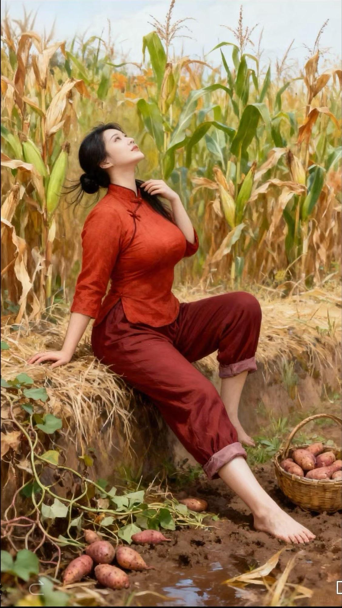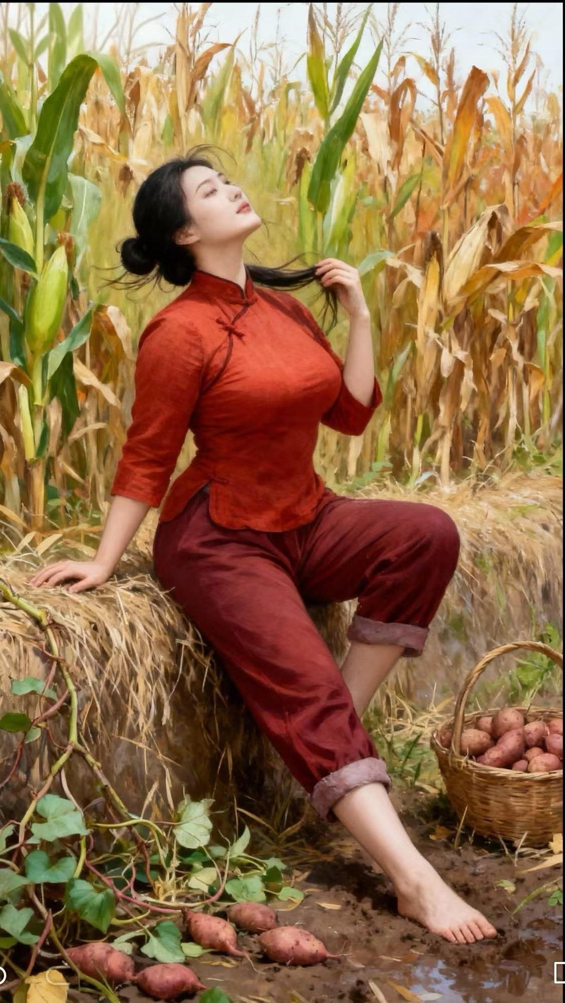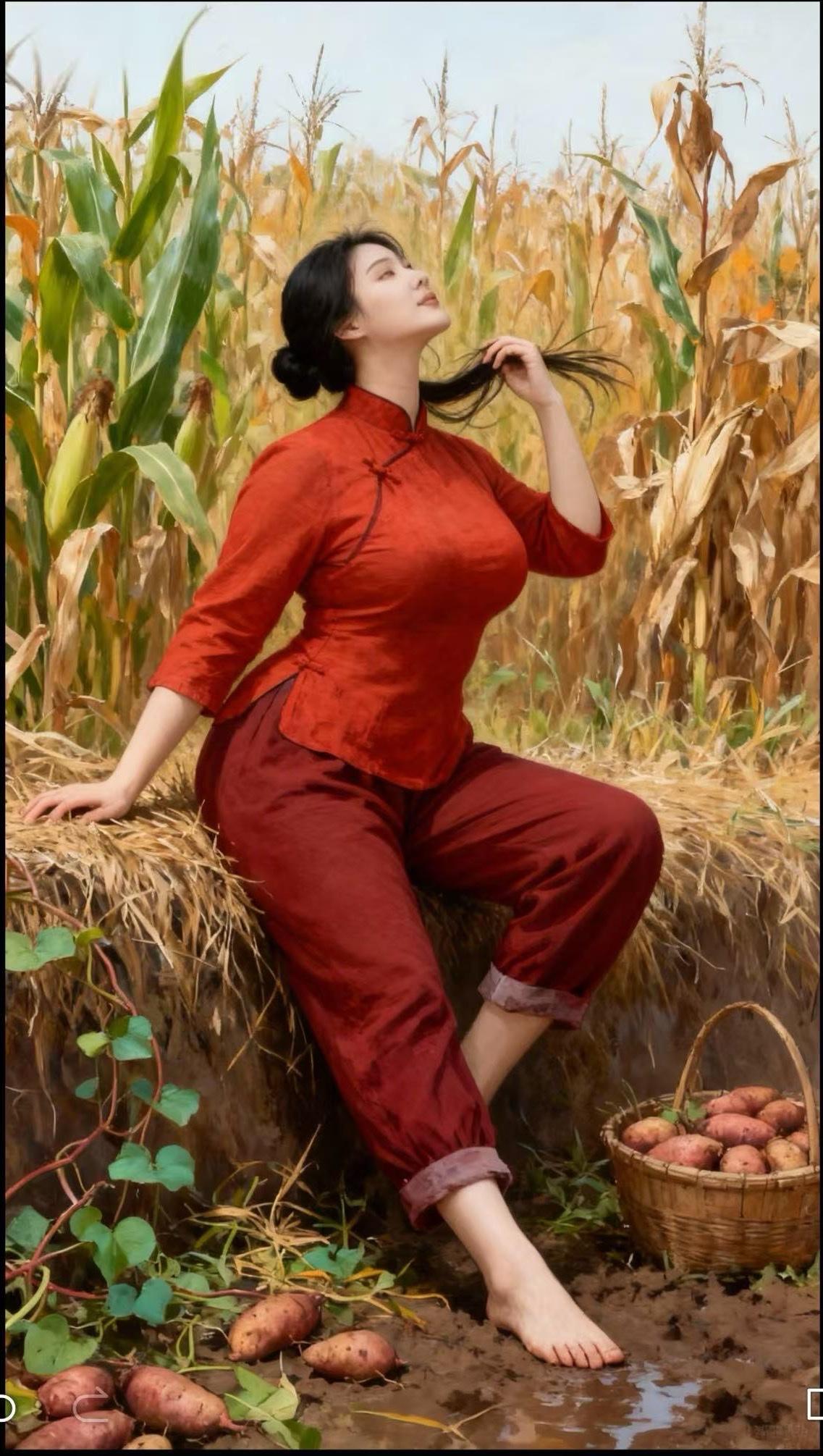 秋收里的巾帼风姿 秋收时节,广袤田野满溢着丰收的气息。一位身着传统红色服饰的女子,悠然坐在田埂上。她神态放松,一只手轻捋发丝,另一只手撑在干草上。身旁,装满红薯的篮子与散落的红薯,彰显着收获的喜悦。金黄的玉米地在微风中沙沙作响,与女子的恬静形成美好画面,勾勒出乡村独有的质朴与温馨。