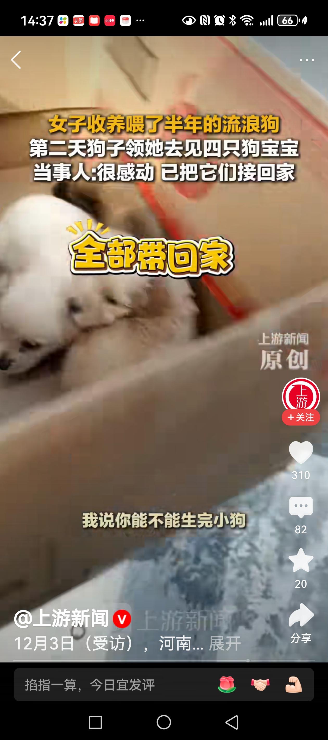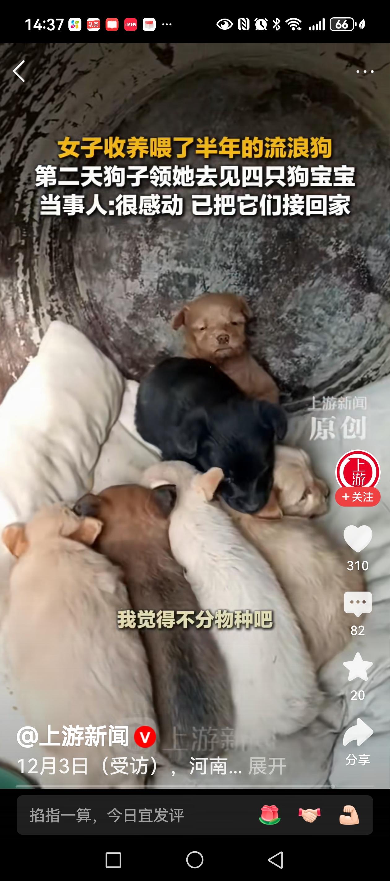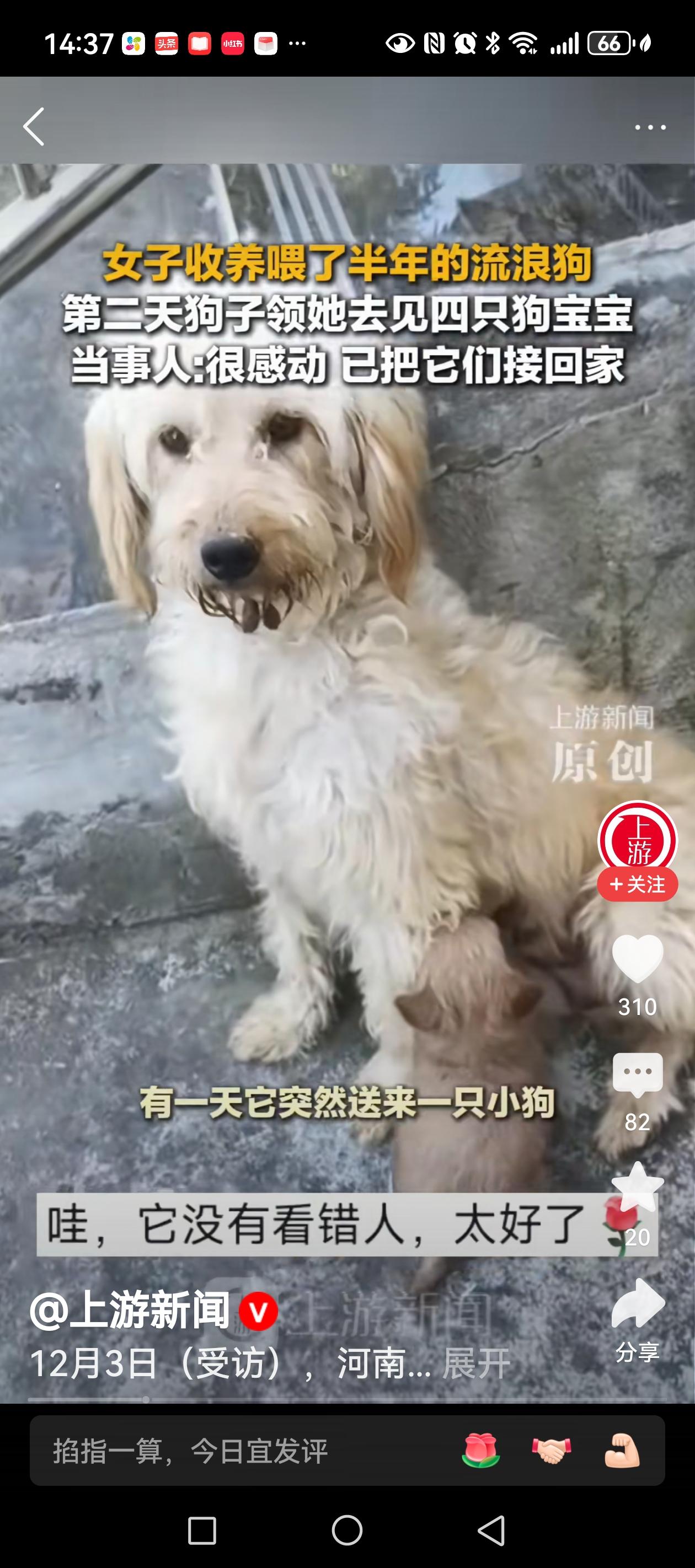 老辈人常说,狗也是通人性的。小时候不太理解,长大后才明白,是因为人对狗的善待,才让狗有了对主人的忠诚。这原来就是人与动物、人与自然的和谐相处。 看了一段视频,让人非常感动。河南一女子每天投喂一只流浪狗,后来狗狗怀孕了,她每次喂狗狗的时候,都喃喃地对狗狗说,等你生了小宝宝送我一只吧! 忽然有一天,狗狗给她送来一只狗宝宝,女子喜出望外。第二天,狗狗又来到她家,她让狗狗在家留了一晚,第二天,狗狗一直对女子哼哼唧唧的叫着。于是女子便跟着狗狗来到村外,不一会儿,狗狗便带着四只狗宝宝从石洞中走了出来。 女子被这一幕感动了,她感叹说,不管是小狗还是人类,母爱真的是太伟大了!女子遂把狗狗一家带回了家。12月3日,上游新闻记者采访了这位女主人,把这段人与动物的感人故事分享给大家!