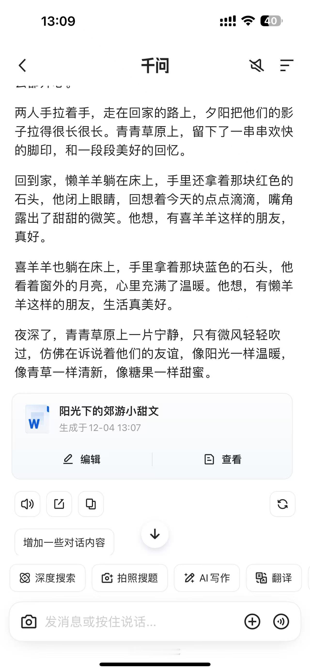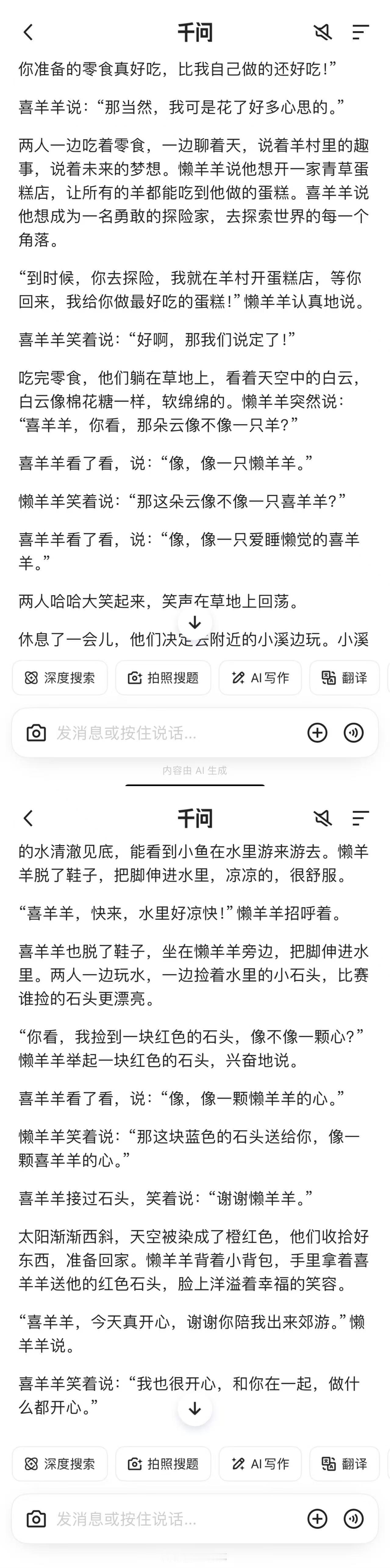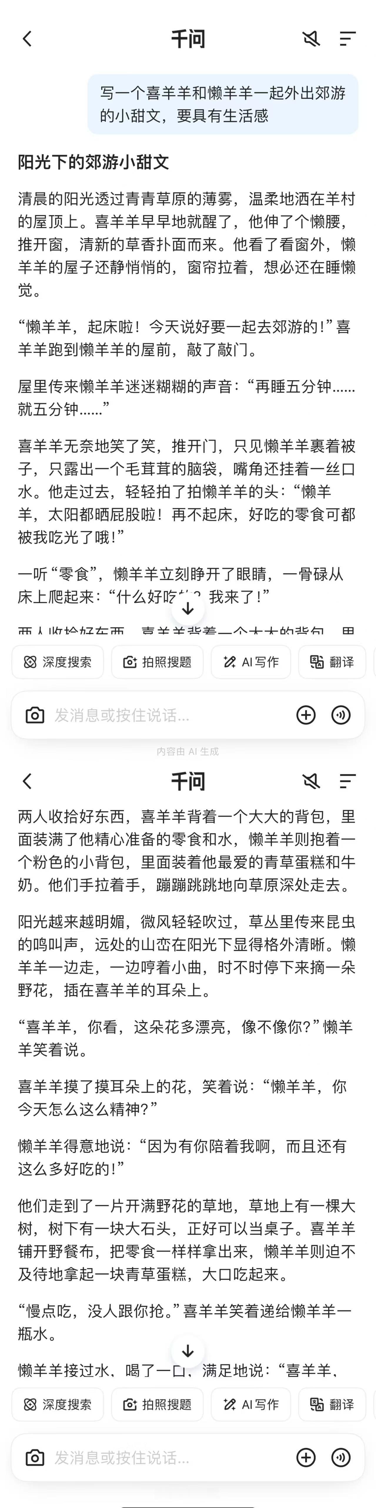 00后有自己的ai磕爱文学 谁能懂官方认证的“瓶盖之交”有多好嗑,懒羊羊一遇到危险就喊喜羊羊,可见有多依赖了~虽然我嗑的cp小众,但不耽误我用千问给自己喂饭,输入几个关键词就能给我哗啦啦变出一堆饭来,幸福到晕厥!喜羊羊 懒羊羊