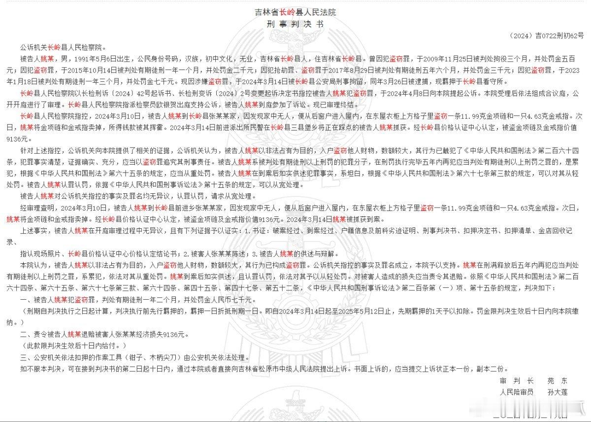 松原市涉事人员姚某身负入室盗窃与命案,且有多次盗窃入狱前科(2009年起多次被抓