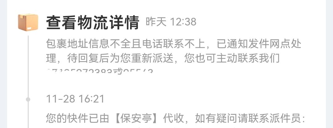 消失的快递 上个月26号晚上, 我一共在网上下了5单 , 目前已经收到3单。 大米、酱油、辣椒酱都已收到, 偏偏平底锅和一箱酸辣粉没收到。 快递员没有给我打过电话, 我查了物流信息, 一下子说我们小区保安亭已经代收, 一下子又说我收货地址不详。 我用小区地址网购收货多年, 其他快递都能收到, 偏偏这家快递公司说我地址不详! 既然地址不详, 物流信息为什么显示小区保安亭代收? 代收过后,又地址不详! 不知道这家快递员玩什么把戏? 我上午去保安亭找快递没找到, 另一家快递员认识我, 她也认识把我快递送消失的快递员, 很热心的帮我联系沟通, 到现在还没消息。 刚巧遇到3栋邻居退快递,网购3斤水果,纸箱被挖了一个洞,水果只剩1斤,离了个大谱! 你们网购的时候遇到过哪些奇葩事? 欢迎留言评论[祈祷][比心] 天气越来越冷, 人心不冷, 老公很贴心, 网购了两箱橙子寄了过来, 生活很平凡, 也不乏美好的时候。