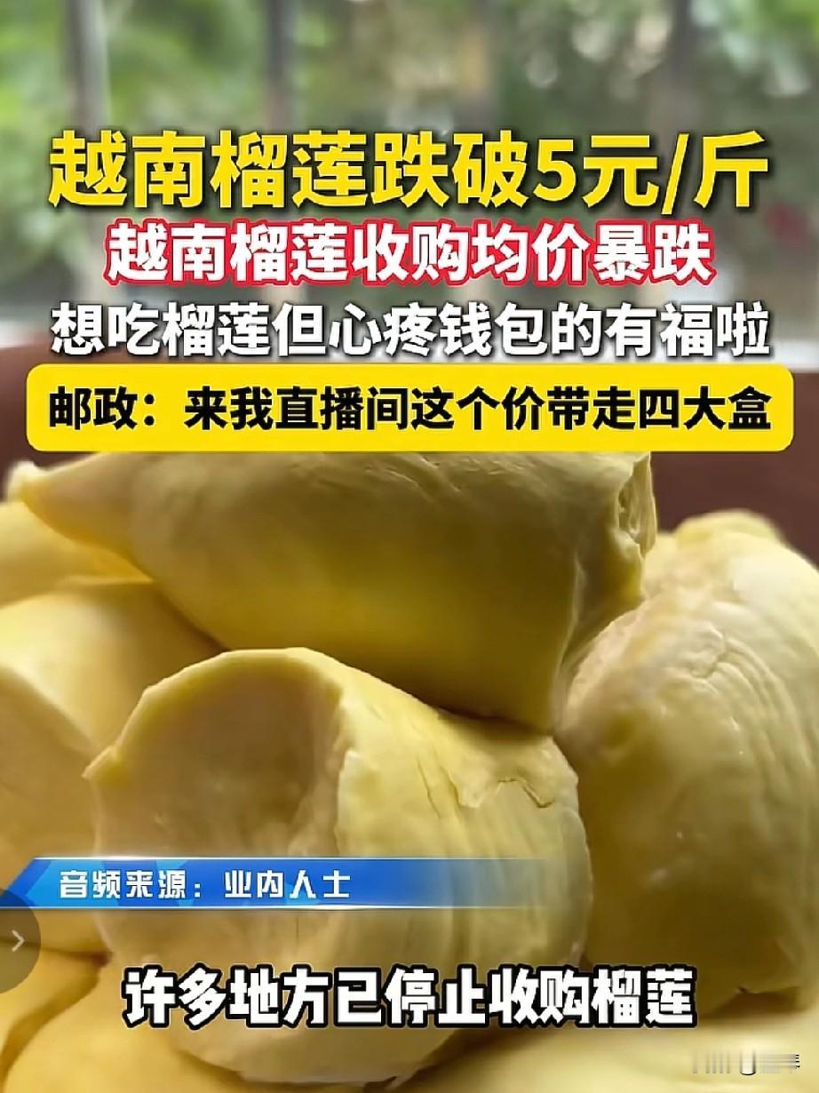 进口5块一斤的榴莲,这“自由”能薅几天? 刷到越南榴莲5块钱一斤的时候,我差点直接冲去直播间抢四大盒——这不得实现榴莲自由了? 但扒了扒才知道,这便宜不是天上掉的馅饼,是越南榴莲“砸手里了”,而不是我们中国,差点空欢喜一场。 前阵子咱们查进口水果查得严,他们不少榴莲查出催熟剂超标、重金属不合格,过不了关,仓库堆成山,只能贱卖清库存。 说白了,这是“滞销甩货价”,不是以后都这价哈。 现在吃这5块一斤的榴莲,得念叨两句:别光看便宜,口感可能踩雷——这榴莲十有八九是没熟就摘下来的,催熟后要么没那股香糯劲儿,要么吃着跟泡了水似的,别抱太高期待。 渠道得挑靠谱的——别买那种“路边散装称斤”的,没检疫的风险高,优先蹲大平台、邮政这种正规直播间的货。 这羊毛薅不了多久——等越南把水果质量整合格了,通关一恢复,这价立马涨回去。真·榴莲自由(天天吃好榴莲不心疼)?那还得看泰国金枕、猫山王这些正经好货,它们价可没降。 总结就是,这两周想花小钱过个榴莲瘾,能冲;但别指望以后天天5块吃榴莲——这便宜,就跟超市临期零食折扣似的,捡个乐子就行~ 冬日生活随拍榴莲