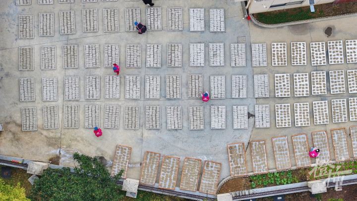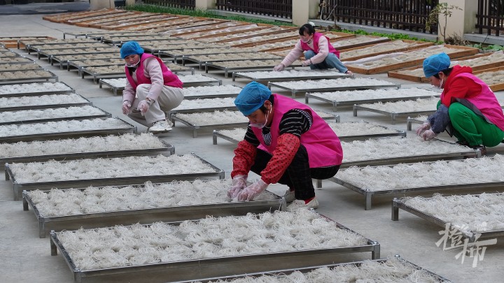 冬日暖阳下,桐庐百江镇松村村的金龙须共富工坊外,800多平方米的晒场上,一排排番薯粉丝如银丝般铺满竹帘,在阳光下熠熠生辉。村民们正忙着将冷却成形的“龙须饼”刨成细长的粉丝,动作娴熟,场面壮观。
