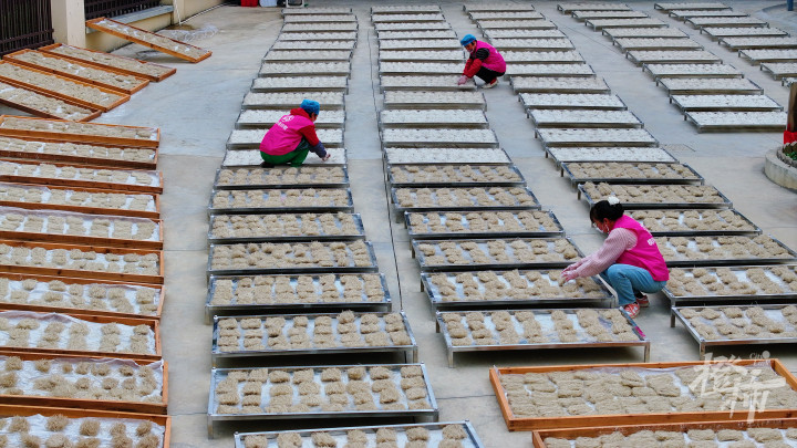 “龙须看似简单,制作却需十余道工序。”金龙须共富工坊负责人胡法霖介绍,从番薯到龙须,要经过多道工艺。首先将番薯洗净、用机器碾碎,淘洗成脱渣的白色淀粉,这就是制作龙须面的原料。随后用水将淀粉稀释,充分搅拌,调制成汤水状液体,再将液体一层一层舀到蒸笼里,蒸熟定型为淀粉饼。之后还要用特制木架固定淀粉饼,用特制铁刨根据客户粗细需要刨成丝。然后把丝折好放在竹篾排上或烘箱中,晒干或烘干成型,即为成品龙须。每一道环节都保留古法工艺,确保粉丝口感劲道、品质上乘。