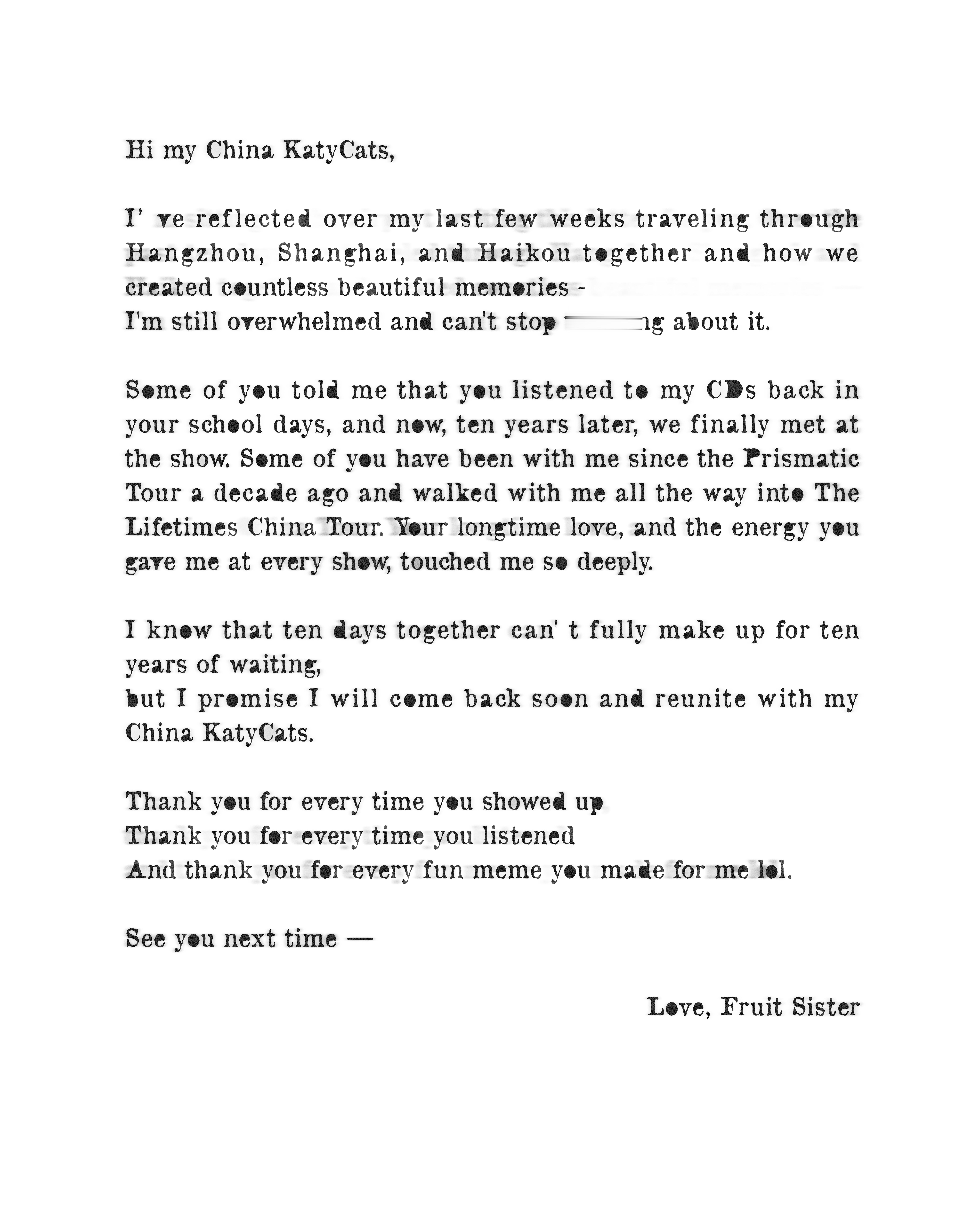 水果姐致中国粉丝的一封信真的会被水果姐的真诚狠狠打动到🥹写给歌迷的信中写到“我知道十天的相聚很难消解这十年的等待,但我向你们保证,我会尽快回来和我的中国 KatyCats重聚”那就期待下次见面好嘛🤲🏻 微博演出大赏万物皆可音乐
