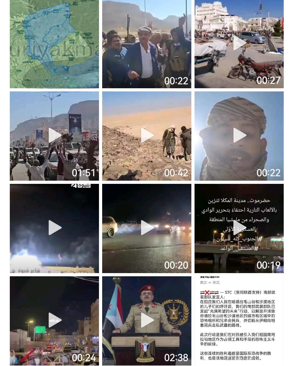 也门南方地区发生巨变:阿联酋支持的“南方过渡委员会”(STC)今天开始对沙特、穆兄会和哈德拉毛部落控制的哈德拉毛省发动大规模进攻,迅速攻占了大量据点,包括赛云市(也门政府军第一军区司令部、赛云机场、赛云总统府、赛云中央银行、政府大楼等)、阿林军营、第37装甲旅的哈沙基地、瓦赫德检查站(这个地方在靠近石油产地)等地。 第37装甲旅是也门政府军第一军区为数不多成建制的部队,昨天第一军区司令兼第37旅旅长萨利赫·贾伊姆拉尼少将还亲自视察了哈沙基地,结果今天第37旅一触即溃,所有装备都丢在基地里(视频显示基本上没有交火),还有人拍到第37旅的士兵脱下军装逃命,沙特人建设了几年的部队完全是一坨。 今天STC的老大祖拜迪已经亲自抵达了赛云市查看他们俘虏的士兵。STC的人也在到处打卡,赛云总统府(赛云宫)、赛云机场等地都有他们的人。然后保留节目也有,不少赛云居民趁乱从赛云政府大楼洗劫电器。然后这几天一直比较高调的“哈德拉毛保卫部队”(部落联军)现在也不敢出来与阿联酋系武装野战,他们兵力有限,只是保住几个石油设施。“哈德拉毛保卫部队”的领导人谢赫·本·哈布里什拍了个视频,话说得也比较模糊,听起来意思是要全力保卫石油设施。不顾这帮人兵力也不多,真正可能蹦跶一下的是2022年和胡塞休战后沙特在也门东部新组建的“国土之盾”部队(作为也门政府的嫡系部队),总共有12个旅,目前正在集结起来支援败逃的第一军区司令萨利赫·贾伊姆拉尼少将,不知道这12个旅能不能打出点效果。 这一轮事态,总体来说可以归纳为由于美国政府准备将穆兄会认定为恐怖组织,也门南方各势力迅速行动起来瓜分穆兄会在哈德拉毛省的脆弱统治资产。如果各方克制一些的话,未来可能是STC(阿联酋系)控制哈德拉毛的城市和政治控制权,哈德拉毛部落联盟(沙特系)控制哈德拉毛的山谷、沙漠和经济利益(油气田),也门政府(沙特、阿联酋支配的空架子)获得哈德拉毛省名义上的控制区。当然还要考虑胡塞的影响;虽然哈德拉毛省不是胡塞武装能插手的地方,但穆兄会依然在塔伊兹有势力,他们和胡塞之间也通过部落血缘关系藕断丝连,胡塞随后和穆兄会打了20多年的仗,但也很可能不会坐视穆兄会在南也门被彻底打垮,所以未来的局势还是很有意思的。 今天也门哈德拉毛冲突的唯一看点:STC的一辆装甲运兵车硬冲也门政府军第一军区的一辆坦克,结果两辆车死在一起了。 也门,在阿联酋的默许下,由阿联酋支持的也门南方过渡委员会(STC)发起了一项名为“未来希望行动”的军事行动,旨在从沙特支持的也门地方武装力量手中夺取哈德拉毛省北部地区的控制权。 在也门南方过渡委员会(STC)与哈德拉毛部落及沙特支持的武装力量之间经历了一段紧张的权力斗争之后,STC部队于昨日开始向萨扬市及哈德拉毛省北部其他地区推进。STC部队成功攻占萨赫村,随后控制了萨扬机场和萨扬市的部分地区,包括总统府。 另有报道称,STC部队已进入特里姆、沙巴姆和卡特兰村,但尚未完全控制这些地区,STC部队遭到反击的可能性依然存在。 目前有大量沙特支持的部队部署在石油资源丰富的地区和阿巴尔公路沿线,预计双方将在这些地区发生激烈冲突。据接近沙特支持的政权的消息人士称,沙特阿拉伯已命令国民警卫队支援第一军区(沙特支持的政权武装力量),以阻止南方过渡委员会(STC)部队在哈德拉毛地区的推进。为此,国民警卫队代表与第一军区指挥官萨利赫·贾伊马利上校举行了会晤。 沙特阿拉伯并未认真介入哈德拉毛冲突,实际上给了南方过渡委员会部队扩大势力的机会。然而,对此事做出判断还需要更多时间,沙特和阿联酋可能计划瓜分哈德拉毛,并消灭在沙特阿拉伯支持下控制也门部分地区的伊斯兰改革党政权。 无论如何,伊斯兰改革党及其支持的部落目前被迫在两个选项中做出选择:1. 与南方过渡委员会部队作战,夺回他们在哈德拉毛的领土;2. 逃往他们的主要基地——马里卜市。STC在拿下萨扬市后公开宣布了胜利。 在经历一段紧张的权力斗争之后,由阿联酋支持的也门南方过渡委员会(STC)武装于12月3日发起了一项名为“未来希望行动”的军事行动,旨在从沙特支持的也门政府军和哈德拉毛部落武装手中夺取哈德拉毛省北部地区的控制权,“恢复哈德拉毛省的秩序并维持安全与稳定”。也门南方过渡委员会武装发言人也证实了这个消息。 行动开始后,也门南方过渡委员会武装从沿海地区向哈德拉毛省内陆推进,并在过去一天里控制了包括萨扬市在内的多个城市、城镇和地点(如军事基地、油田和难民营等)。之后这些地区的居民开始举行庆祝活动。 在阿曼的斡旋下,也门胡塞武装释放了今年7月上旬击沉的ETERNITY C号商船的船员,已被转移至马斯喀特。 也门最东边的迈赫兰省(沙特阿拉伯传统势力范围)今天直接向STC投降,移交所有军事设施,不知道这些年沙特人在这里经营了个什么。