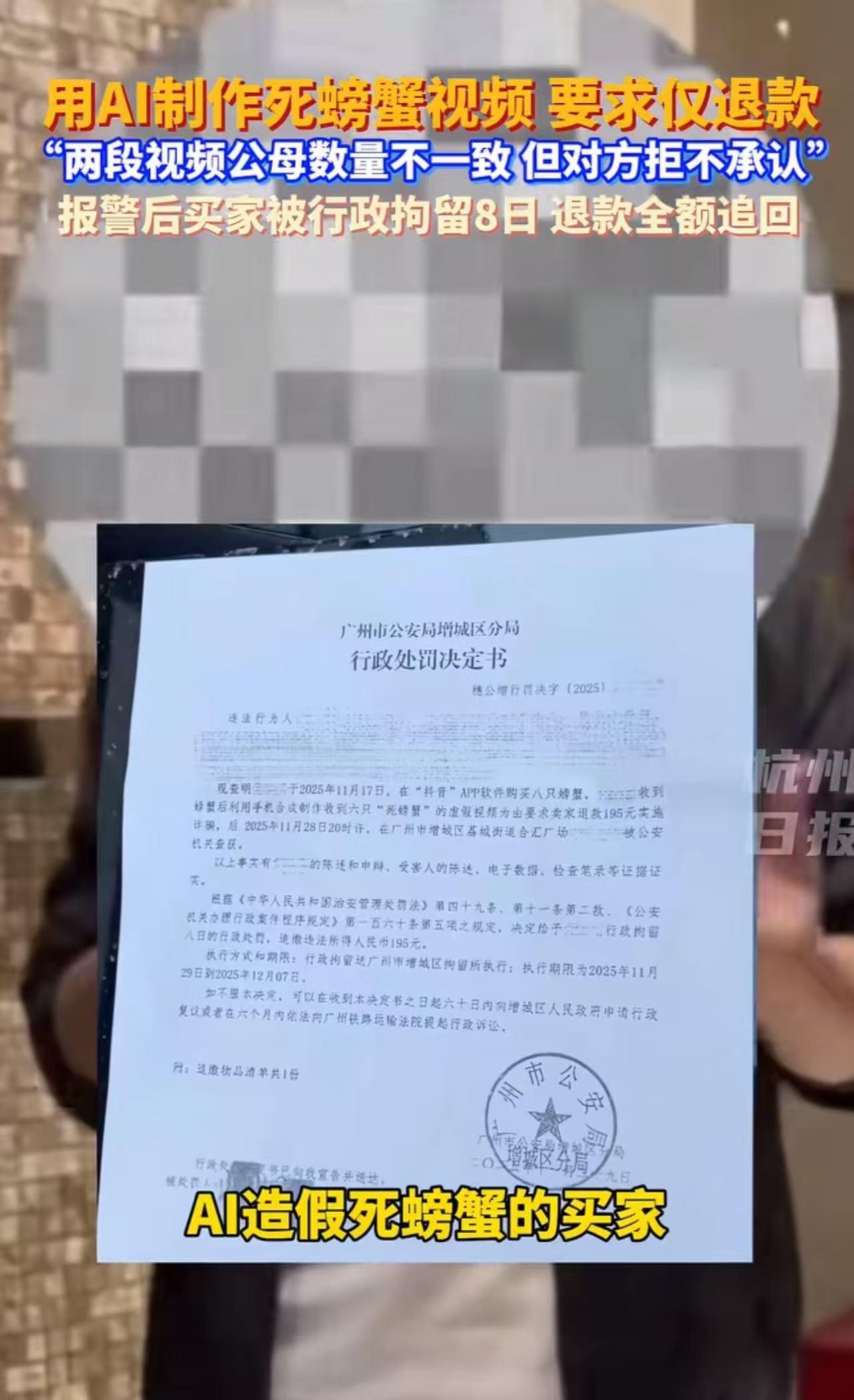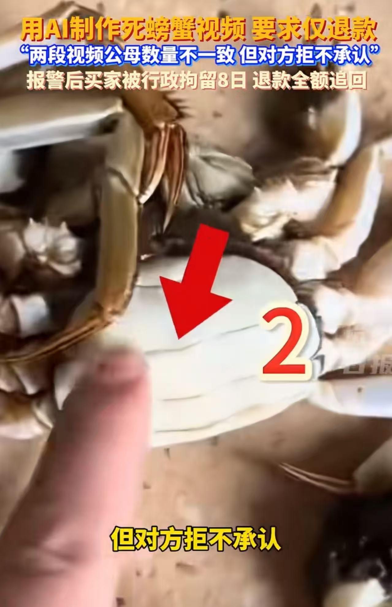 “大快人心!这次白嫖党栽了!”一买家自作聪明,用AI生成死螃蟹视频申请仅退款,被行政拘留8日!原来,AI 生成的视频足以以假乱真,卖家一开始真的被骗了,把钱退给了买家。但卖家后来发现视频里有个破绽,选择了报案!网友:又馋又穷又坏,全占了! 事情是这样的,买家在收到商家寄来的螃蟹后,立马联系商家,声称自己收到的8只螃蟹里,有6只已经死了。 因为商家在售卖时承诺死蟹包赔,买家就要求商家仅退款。 商家一听,赶忙诚恳地向买家道歉,还让买家提供一下死螃蟹的证据,心里想着如果是自己的问题,那肯定得负责到底,可不能让顾客受了委屈。 很快,买家就发来了图片和两段视频。在那视频里,买家用手指轻轻戳着螃蟹,只见那些螃蟹背仰躺着,一动不动,确实像是死透了一样。 商家看到这视频和图片,一时间也没多想。毕竟视频里的场景看起来那么真实,螃蟹那死气沉沉的模样,任谁看了都会觉得是真的死了,谁能想到这里面会有猫腻呢? 于是,商家没再多说什么,按照买家的要求,给买家退了195元。 可事后,商家越想越觉得不对劲。他卖了这么多螃蟹,偶尔死个一两只正常,但这次一次性死6 只,这概率太低了! 于是商家又仔细回看了那两段视频。这一看,还真让他发现了破绽。原来,买家发来的两段视频里,前后那6只所谓的“死螃蟹”性别不一致,外形形状也差别很大。 商家意识到:这图片和视频该不会是AI合成的吧? 商家尝试着跟买家沟通,希望买家能说实话,把事情说清楚。可对方却拒不承认,还一口咬定自己发的就是真实的死螃蟹视频,态度十分强硬。 商家见沟通无果,果断选择了报案。警方接到报案后,迅速展开了调查。在警方的强大攻势和确凿证据面前,买家终于低下了头,承认了自己为了白嫖那195块钱,利用AI技术生成了死螃蟹的视频这一恶劣行径。 虽说195块钱不算多,但买家这种行为已经涉嫌诈骗了。法律可不会因为金额小就姑息这种违法行为。 最后,警方依法对买家处以拘留8日的处罚,并且把那195元也追了回来,还给了商家。 此事引发热议,有网友说,真是一个人才!买八只,拘留八日 ,一只一天! 也有网友说,干了这些年电商,除了鬼没见过了!这一家只是追究了,应该好好查查他到底白票了多少商家?估计不只是这一家。 还有网友说,所以这个AI到底有没有必要存在?好多人被骗! 在我看来,这买家的行为简直就是又馋又穷又坏,把贪婪和无耻演绎得淋漓尽致。在如今这个诚信为本的社会,诚信就像是一张通行证,没了它,寸步难行。 买家为了那一点小便宜,不惜采用这种欺诈的手段,不仅损害了商家的利益,让商家辛苦经营的成果付诸东流,也破坏了良好的市场秩序,让整个市场环境变得乌烟瘴气。 这种行为必须得到严厉的打击和谴责,只有让这些心怀不轨的人付出沉重的代价,才能让社会更加公平、公正、诚信,让那些真正努力经营、诚信待人的商家能够安心做生意,不用担心被无端欺诈,让消费者也能放心消费,不用担心买到以次充好、虚假宣传的商品。 否则,如果这种欺诈行为得不到遏制,社会的诚信体系将会受到严重的冲击,最终受损的还是我们每一个人。 (来源:洛视频)