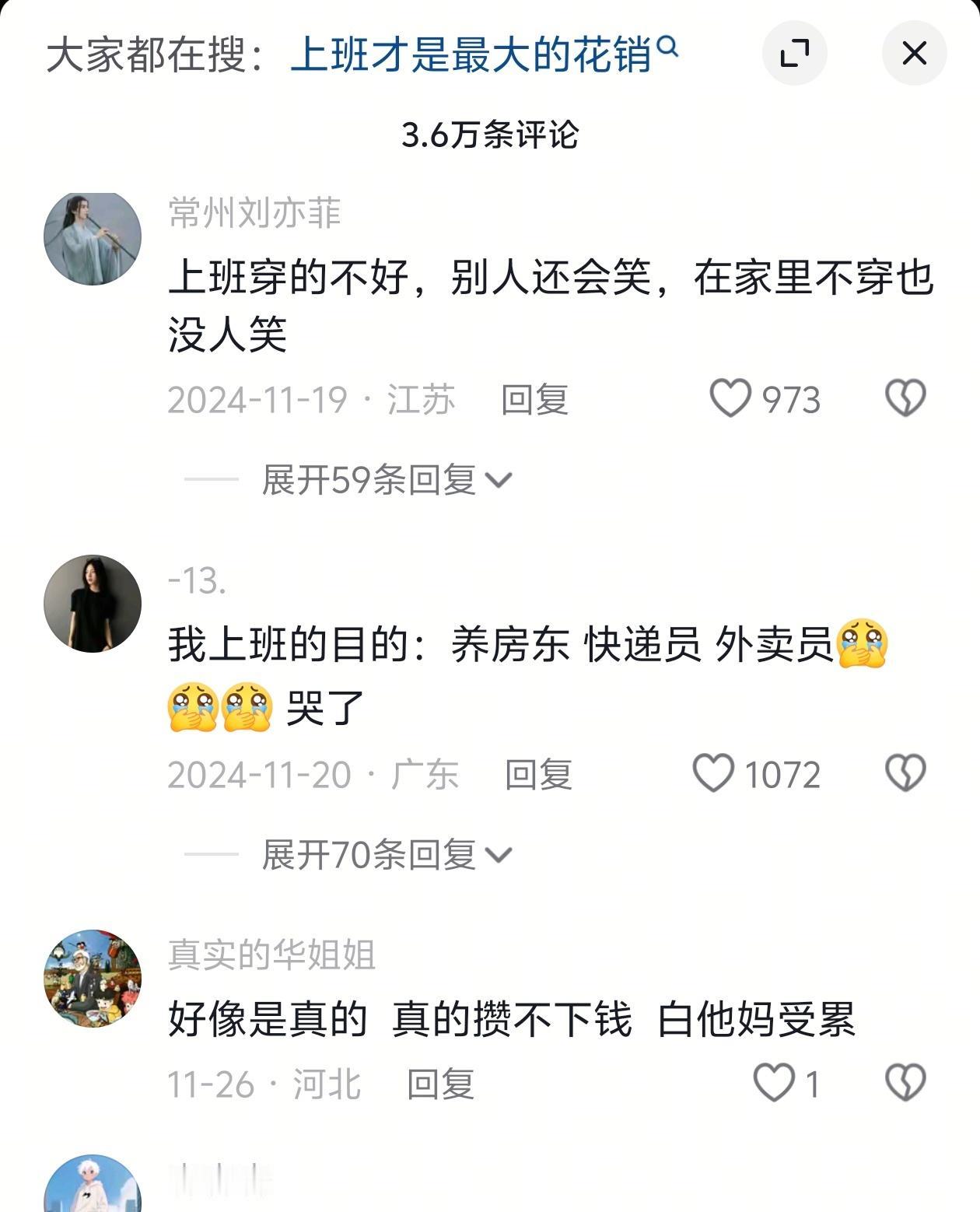 最近有个扎心段子:“家里快供不起我上班了。” 乍一听荒唐,仔细一算账,冷汗直冒。 以前觉得上班就是赚钱,现在才发现,上班才是最大消费。 早上挤地铁,来回十五块; 中午外卖,不敢点太贵,三十; 晚上加班回家,累到不想做饭,再掏四十。 这还没算咖啡续命、同事聚餐、夏天空调房里的外套、冬天通勤路上的靴子——哪样不是钱? 更别说那些“隐形税”。 上班得穿得体面吧?衣柜里那件“能见人”的衬衫,连穿三天了。 写字楼里人人光鲜,你总不能拖后腿。 还有随不完的份子、聚不完的餐,人家开口了你不好不去,去了钱包就叹气。 要是再有个娃,好家伙,直接开启“碎钞机模式”。 工资刚到手,幼儿园费用扣一半,剩下点零头刚好够买奶粉尿布。 你盘算半天,发现自己这一个月的忙活,全在给托管班和兴趣班打工。 老公说:“要不你别上了?”你张张嘴,竟然反驳不了。 听起来像笑话,可笑着笑着就沉默了。 我们不是不想工作,是算盘打烂了也算不过现实。 一个月拼死拼活,最后余额比脸干净,还得靠父母偶尔“补贴”买菜钱。 这哪是上班,简直是贴钱打工。 有人说,这是矫情。 可只有经历过的人才懂:当上班的成本无限逼近收入,工作的意义就开始摇晃。 我们失去的何止是钱? 是早晨孩子没醒就出门的遗憾, 是晚上到家只剩疲惫的空洞, 是那种“我到底在忙什么”的迷茫。 当然,不是劝人辞职。 只是这背后的问题,值得细想:什么时候开始,上班成了奢侈消费? 什么时候开始,养活自己需要全家输血? 或许我们该承认,有些班,上得确实有点贵。 贵不在工资,而在那些被忽略的代价里——时间、健康、陪伴,还有那份本该从容的生活。 你呢?这个月上班,赚了还是“亏”了? 评论区聊聊,我给你算笔账。
