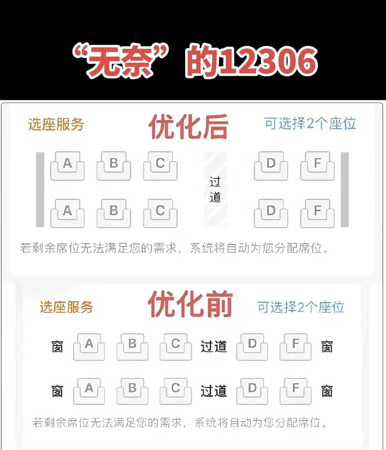 一开始觉得高铁去掉(优化)选座页面的窗户文字是小题大做,直到看见有那么多人真的因为座位写窗没有窗而去投诉要说法,才明白高铁有多委屈,原本就是一个指向性的说明,为了方便识别才用窗户标记,反而被当成了服务瑕疵,好在评论区比较理智,一方面理解高铁的难处一方面也认为这是有人在钻牛角尖。 那么问题来了,有评论说不标记也不人性化,应该按照每辆列车的实际情况把窗户都按位置给画上……