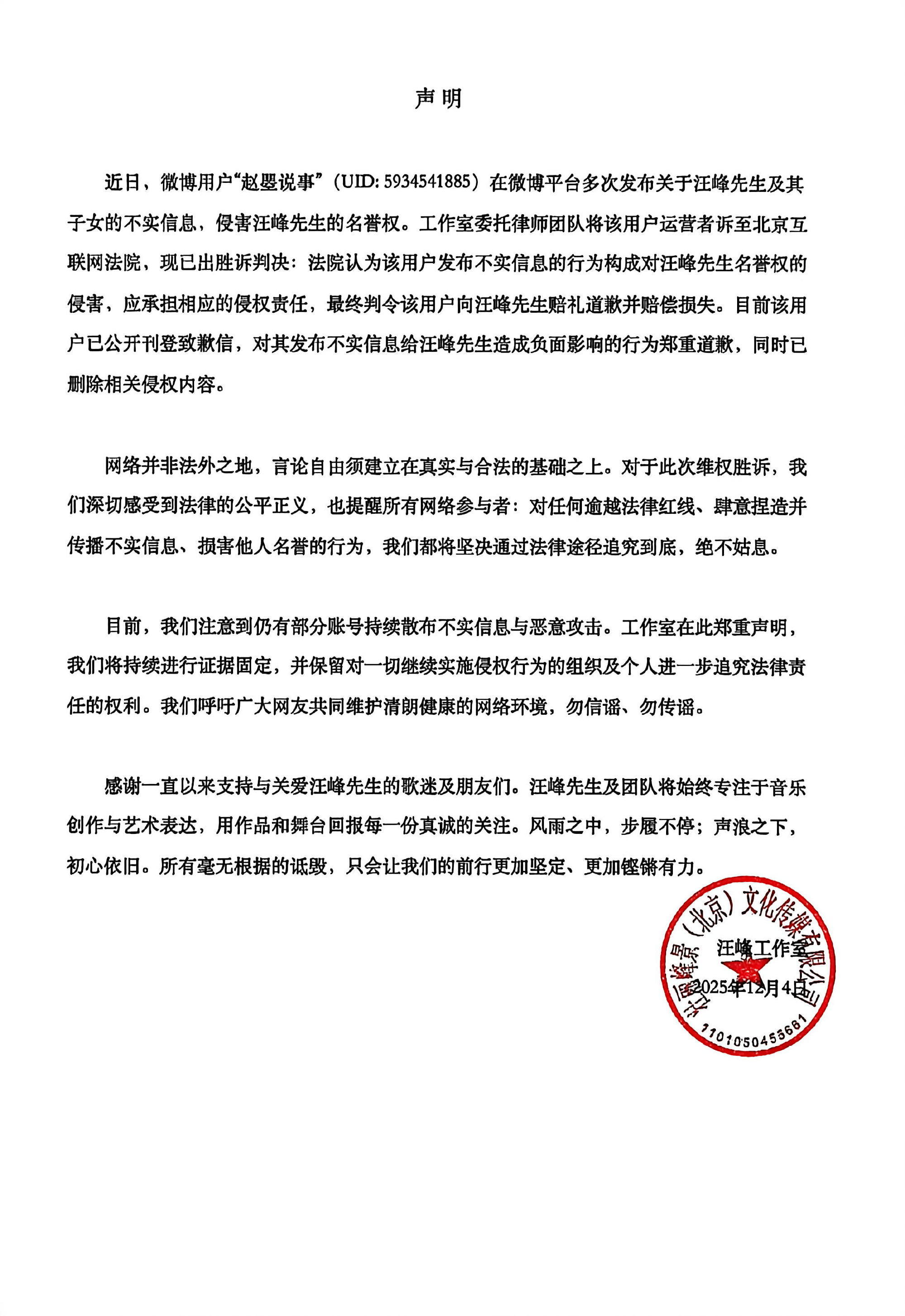 汪峰起诉赵瞾说事胜诉 汪峰工作室起诉赵瞾说事胜诉。