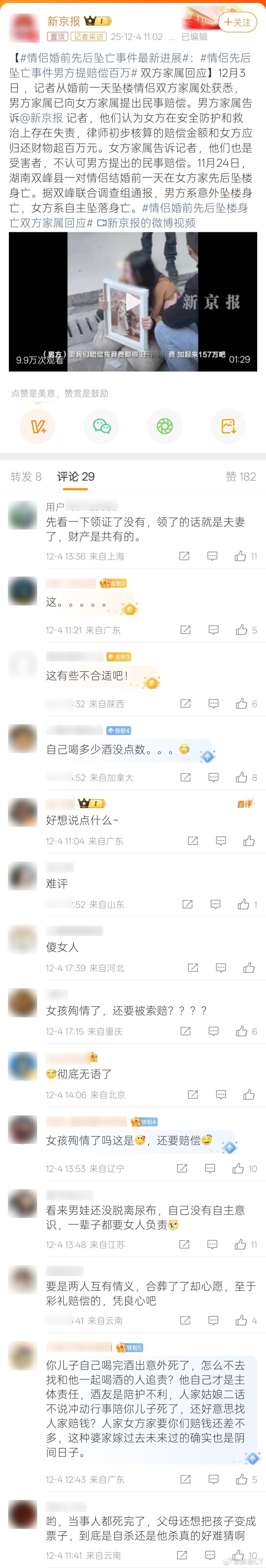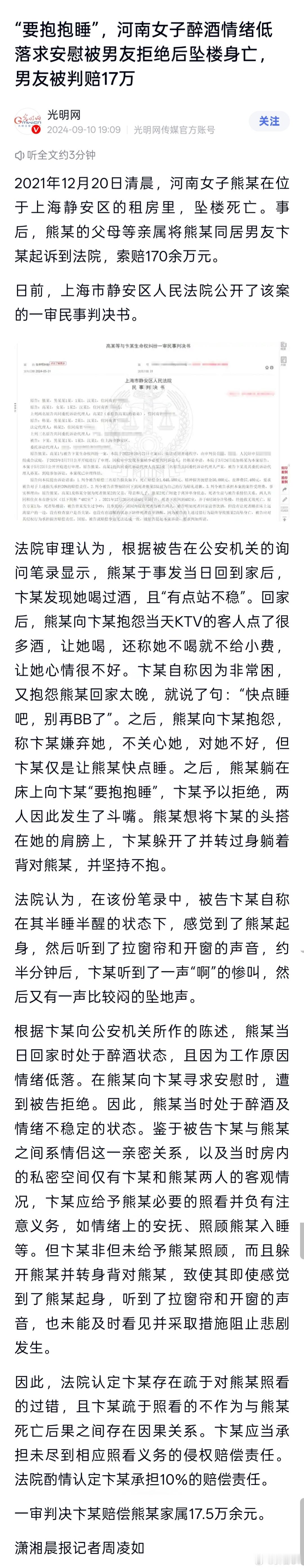 这案子的后续赔偿如何,看双方如何协调及法院如何判决。我看到有不少人在评论区表示,其男方是自己喝酒意外死亡,怎么其家属还要找女方父母承担责任?这里给大家分享个真实案例。2021年,河南一女子醉酒后向男友抱怨称,客人点了很多酒让她喝,不喝酒不给小费。她感觉心情很不好。其男友当时非常困,就搪塞了句,“赶紧睡吧,别BB了。”但女方依旧不依不饶,抱怨男友嫌弃她,不关心她,对她不好,还向男友要抱抱。男友拒绝,并与其发生争吵。后女子跳楼身亡。法院审理后认为,其男友存在疏于对女子照看的过错,且其疏于照看的不作为与女子死亡后果之间存在因果关系,应承担未尽到相应照看义务的侵权赔偿责任。最终,法院酌情认定其男友承担10%的赔偿责任,向其女友家属赔偿17.5万。情侣先后坠亡事件男方提赔偿百万实务案例看一看