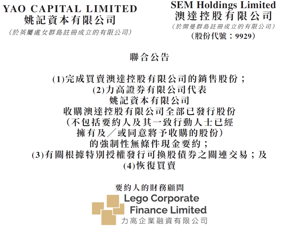 12月3日,澳达控股及要约人姚记资本有限公司联合发表公告称,2025年11月26日,要约人完成向SEMEnterprisesLimited收购15亿股股份,相当于当日已发行股份总数的75%;总现金代价为1.65亿港元,即每股销售股份0.11港元,较股份于最后交易日于联交所所报收市价每股股份0.103港元溢价约6.36%。