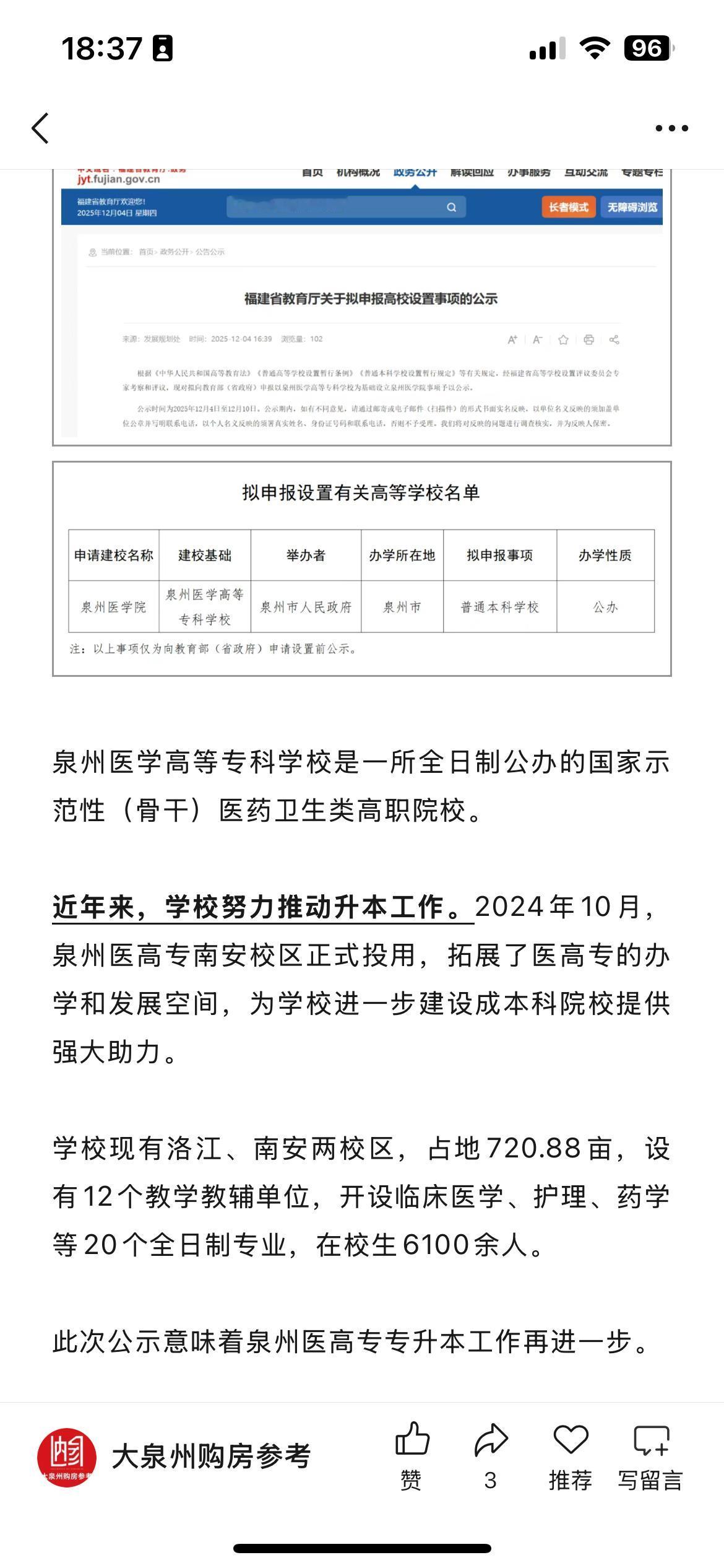 教育部最新批示!泉州医学院来了!泉州医高专拟升级为本科!高教格局将迎新变化,泉州医学高等专科学校是一所全日制公办的国家示范性(骨干)医药卫生类高职院校。 近年来,学校努力推动升本工作。2024年10月,泉州医高专南安校区正式投用,拓展了医高专的办学和发展空间,为学校进一步建设成本科院校提供强大助力。 学校现有洛江、南安两校区,占地720.88亩,设有12个教学教辅单位,开设临床医学、护理、药学等20个全日制专业,在校生6100余人。此次公示意味着泉州医高专专升本工作再进一步。