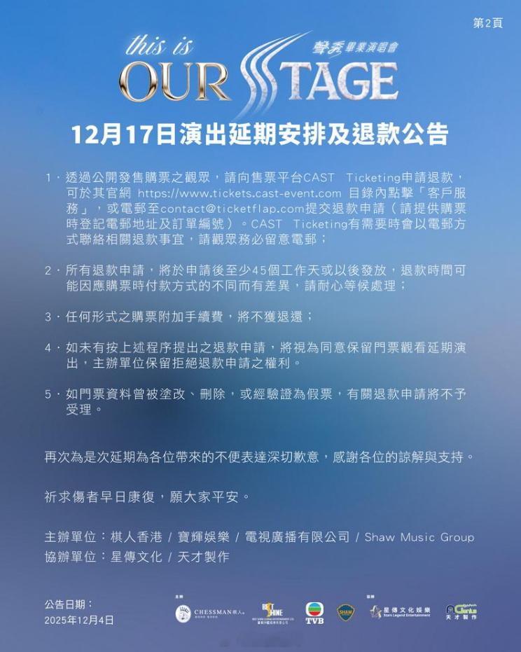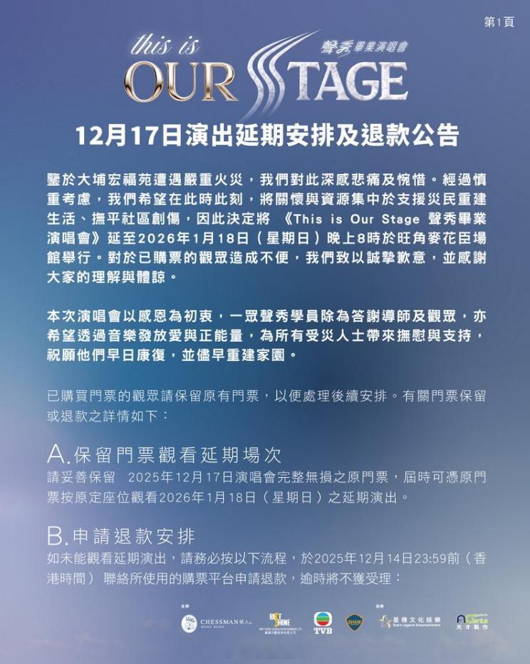 【明報即時】大埔宏福苑五級火|《聲秀畢業演唱會》延至明年1.18舉行 鑒於大埔宏福苑遭遇嚴重火災,團隊決定將 《This is Our Stage 聲秀畢業演唱會》延期舉行。(Ig圖片)原定於12月17日(周三)在旺角麥花臣場館舉行的《This is Our Stage 聲秀畢業演唱會》,鑒於大埔宏福苑遭遇嚴重火災,全城哀痛,團隊經過慎重考慮後,將關懷與資源集中於支援災民重建生活、撫平社區創傷,決定將 《This is Our Stage 聲秀畢業演唱會》,延至2026年1月18日(星期日)晚上8時於旺角麥花臣場館舉行。本次演唱會以感恩為初衷,一眾聲秀學員除為答謝導師及觀眾,亦希望透過音樂發放愛與正能量,為所有受災人士帶來撫慰與支持,祝願他們早日康復,並盡早重建家園。(即時娛樂)
