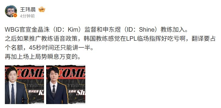 WBG官宣金晶洙(ID:Kim)监督和申东煜(ID:Shine)教练加入。