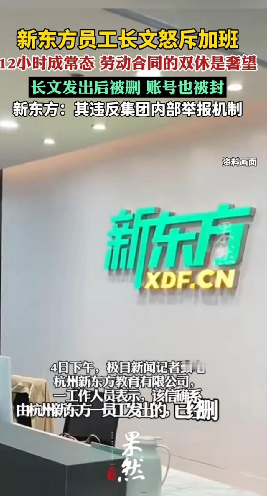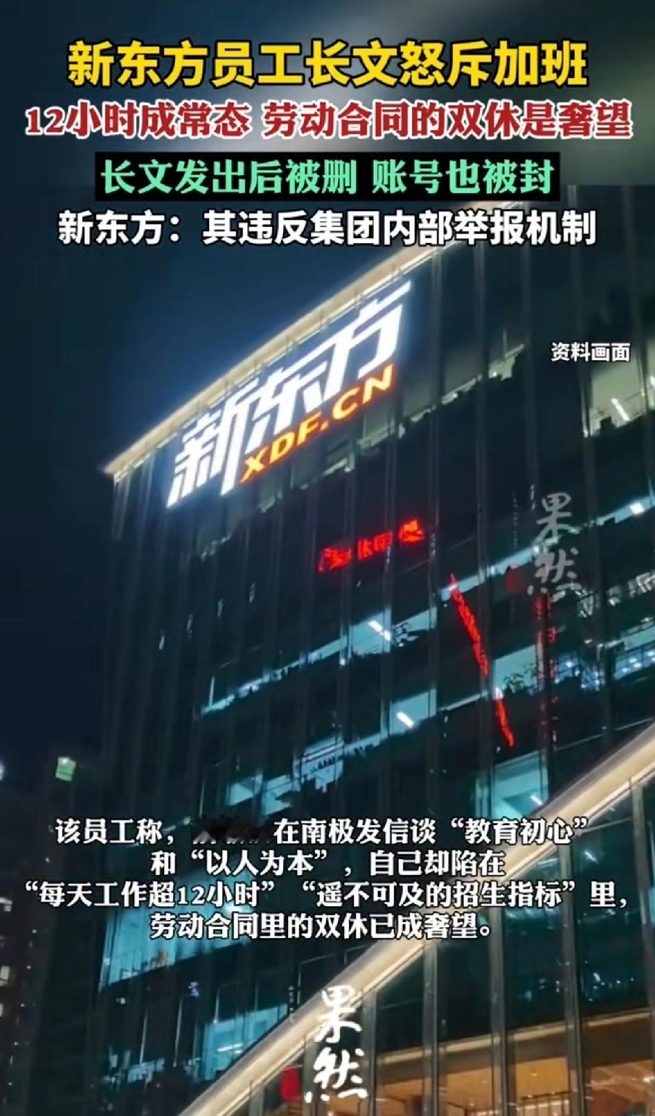 只是发文怒斥加班,账号就被封了,俞敏洪打出的有“温度”的老板这个旗号,有员工当真了。 真的发文怒斥加班,每天工作超12个小时。 劳动合同里的双休已成奢望。 新东方又上热搜了,新东方给出的答案是:不符合集团内部举报机制? 内部举报机制,是不是不能对外泄露公司的上班时间。 总感觉俞敏洪一副伪善的表现,总是表现自己多么善待员工,是个好老板。 可又频繁被员工背刺,到底是谁的问题呀?