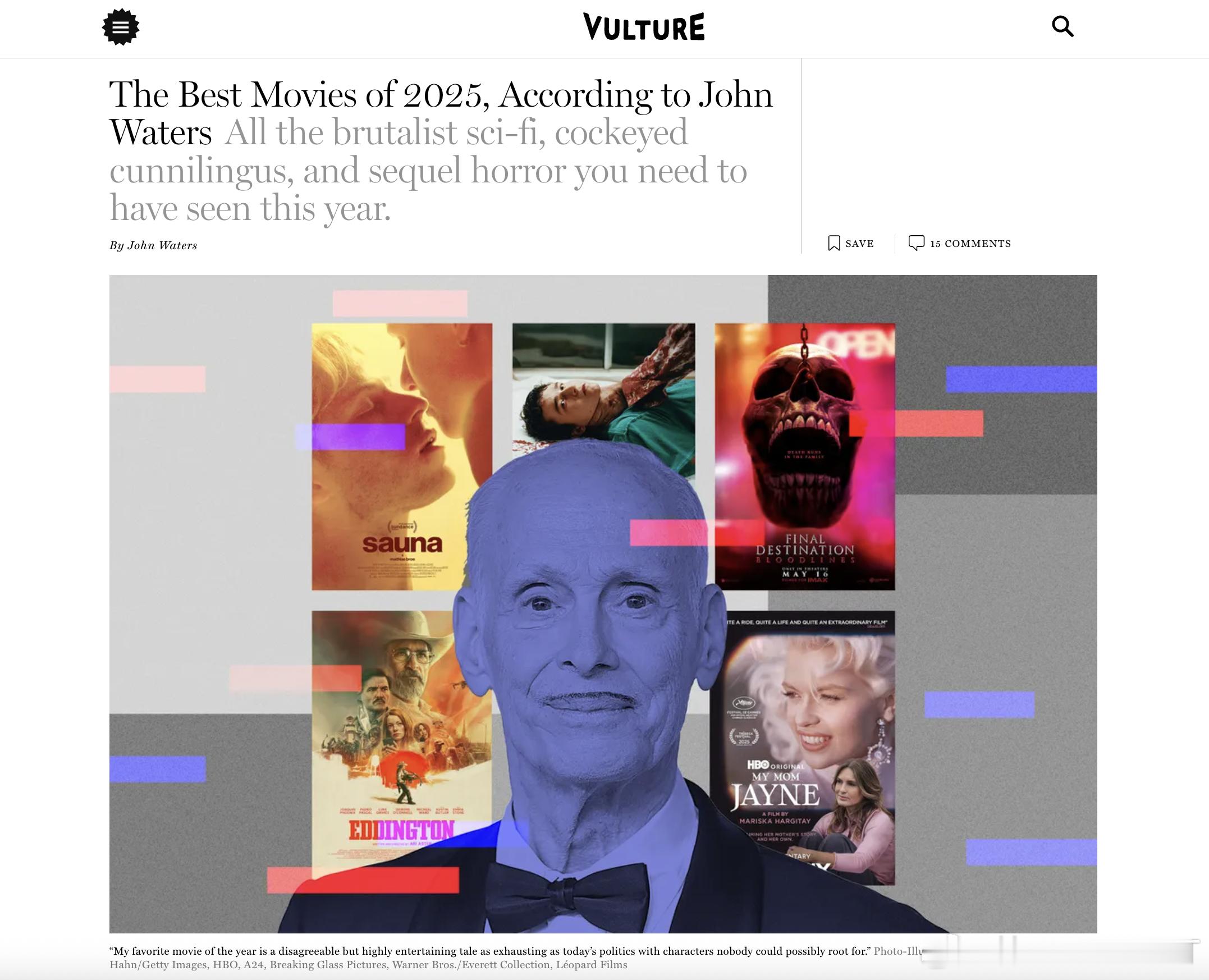 约翰·沃特斯心中的 2025 年度最佳电影只有在纽约市,你今年才有可能看到我排名前十的所有电影。感谢天上和地下的神祇(甚至可能是电影之神),感谢纽约电影节,感谢那些对古怪艺术电影的经营往往比所谓的商业大片更成功的复映影院,以及感谢所有仍然前往这座城市朝拜另类电影的影痴们。试想一下,吉姆·贾木许(Jim Jarmusch)、理查德·林克莱特(Richard Linklater)、格斯·范·桑特(Gus Van Sant)、凯瑟琳·毕格罗(Kathryn Bigelow)、斯派克·李(Spike Lee)和保罗·托马斯·安德森(Paul Thomas Anderson)都成功地获得了他们标志性风格电影的融资和发行——简直是奇迹!以下是我那些操蛋的挚爱;它们需要一切可能的帮助。1. 《爱丁顿》(Eddington)(阿里·阿斯特 Ari Aster)我今年最喜欢的电影是一个令人不快但极度娱乐的故事,它像今日政治一样耗人心神,里面的人物没有人会去支持。然而,它又恐怖得滑稽可笑,令人困惑地禁欲又变态,让你看完后会感到神经兮兮,但又“文化味十足”。如果你不喜欢这部电影,我恨你。2. 《死神来了:血脉诅咒》(Final Destination: Bloodlines)(亚当·B·斯坦 Adam B. Stein, 扎克·利波夫斯基 Zach Lipovsky)这是有史以来最酷的电影系列的最佳续集。凶猛、破碎,充满了如此多可怕、扭曲的惊喜——这部影片超越了烂片的界限,进入了剥削艺术的全新领域。3. 《性梦爱三部曲》(Oslo Trilogy)(达格·约翰·豪格鲁德 Dag Johan Haugerud)三部绝妙的挪威电影,由英格玛·伯格曼(Ingmar Bergman)王位最新的继承人执导,关于所有同性恋和异性恋的爱与情欲是多么复杂、充满希望,又彼此相似。这是很长一段时间以来关于浪漫最聪明的对话。4. 《接近终点》(Sirāt)(奥利弗·拉克斯 Oliver Laxe)退下吧,《疯狂的麦克斯》(Mad Max)。快点吧,《恐惧的代价》(The Wages of Fear)。这部令人瞠目结舌的全新电影公路之旅,是通往饱受战争蹂躏的摩洛哥沙漠中一场狂欢派对的,让那些经典看起来像慢吞吞的家伙。一场又一场难以言喻的悲剧,使这个剧本成为有史以来被拍成电影的最佳“致郁系”迷幻酸性冒险。它会炸裂你的心灵……【剧透警告】 字面意义上的。5. 《桑拿》(Sauna)(马蒂亚斯·布罗厄 Mathias Broe)就像现代版的安迪·沃霍尔(Andy Warhol)的《垃圾》(Trash),这部性感且表演精湛的首部长片讲述了一段发生在一位在哥本哈根浴室工作、负责清理寻欢洞(glory holes)的健美时髦男同性恋,和一位现自认为男同性恋的跨性别男性之间的恋情。怪蛋舔阴(Cockeyed cunnilingus)——一个值得深思的全新领域?6. 《室温》(Room Temperature)(丹尼斯·库珀 Dennis Cooper, 扎克·法利 Zac Farley)一部刻意乏味而温柔、富有诗意、令人挠头的电影,聚焦于一个家庭正在布置他们社区的房子,使其成为一个万圣节恐怖屋。正当你开始讨厌这部电影时,你会突然意识到——咦?我爱它。它很怪异、令人毛骨悚然,而且可能……只是可能,太棒了。7. 《宽恕》(Miséricorde / Misericordia)(阿兰·吉罗迪 Alain Guiraudie)一部变态到难以想象的惊悚片,谋杀、隐秘的乱伦和对一个有罪男人的不当迷恋交织碰撞,性情节的扭转和一个绝妙的怪异结局让观众目瞪口呆。哎哟喂! 这片子彻底失控了!8. 《秋日何时来》(When Fall Is Coming)(弗朗索瓦·欧容 François Ozon)一部感人(你听我说过这个词吗?)、不带批判性的剧情片,讲述了一位退休妓女和她善良但充满愤怒、隐秘的同性恋成年儿子。儿子出狱后教导母亲,也许谋杀才是正确的做法。9. 《我的妈妈,简》(My Mom Jayne)(玛莉丝卡·哈吉塔 Mariska Hargitay)一部顶级的纪录片,揭示了关于简·曼斯菲尔德(Jayne Mansfield)和她的家庭一个又一个秘密,将让你紧张地坐到座位的边缘,甚至可能让你哭出来。10. 《帝国》(The Empire)(布鲁诺·杜蒙 Bruno Dumont)我不是科幻片的粉丝,但当一艘野蛮主义的宇宙飞船降落在法国北部时,我跪下来膜拜船上的变异神灵。直到看完后读新闻稿,我才意识到这个剧本原来是想搞笑的。它是搞笑的。有点。不是那种哈哈大笑的搞笑。也不是那种奇怪的搞笑。而是那种哈哈大笑式的奇怪搞笑,就像导演本人一样。