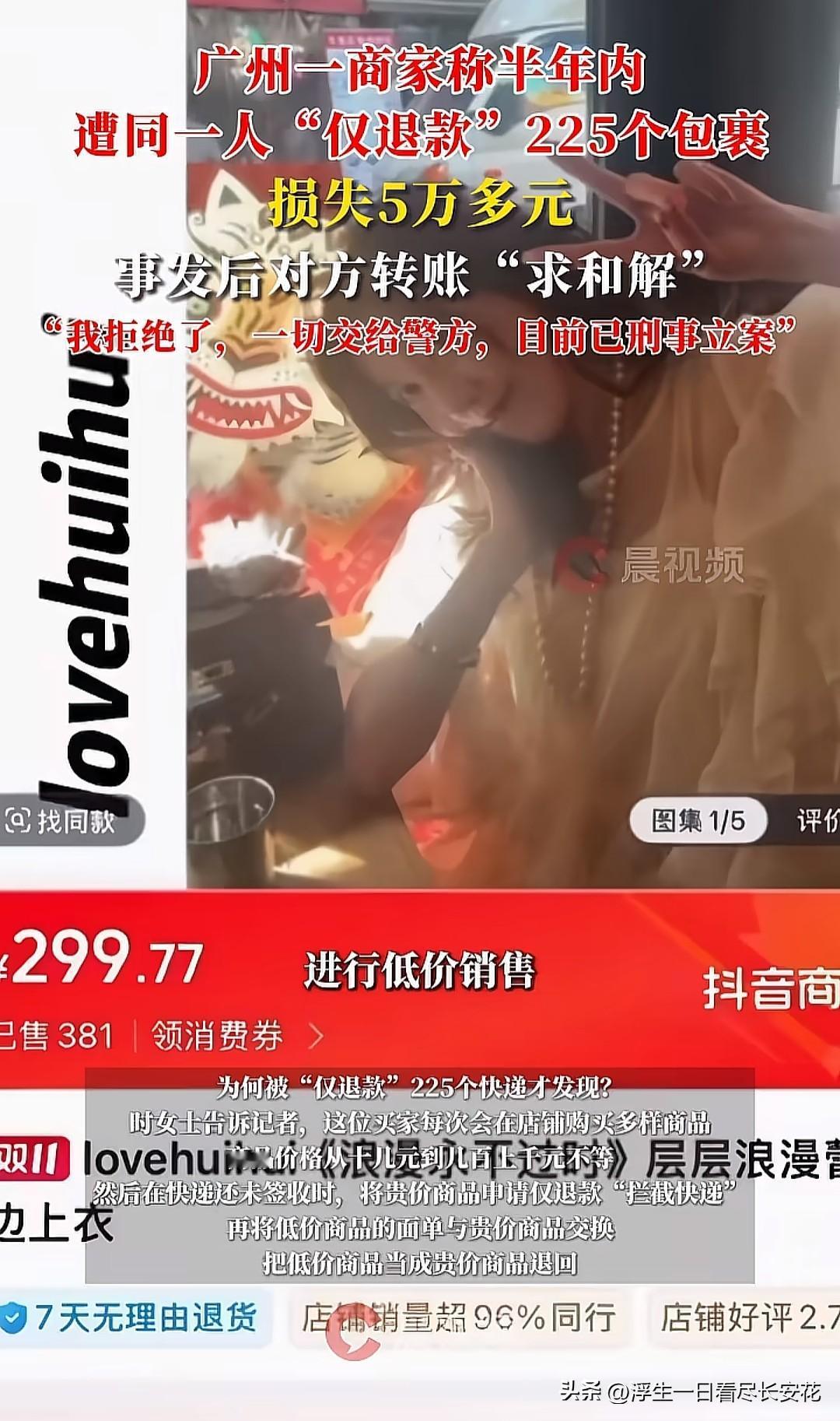 最近,山东烟台的刘女士因光薅一只羊上了热搜!刘女士薅羊毛可谓出了名,抓一只羊拼命地薅,足足薅了225单,到手的衣物然后再低价转售,赚的盆满钵满。 像刘女士这样的,应该会提前买一些便宜货,取件时驿站搞不懂为什么会没有出库,app里和商家那边都显示待取状态,然后趁这个时差把收到的货通过手段换成已准备的便宜货,再直接申请快递拦截仅退款。 普通人是做不到拦截快递的,刘女士做到了,可见这不是一人所为。商家曝光此事后,刘女士想和解,但被拒绝了,因为很多商家也遇到了类似的情况,损失惨重,看来这些“薅羊毛”的人不是一个人,是一批人,可能已经有完整的产业链了。