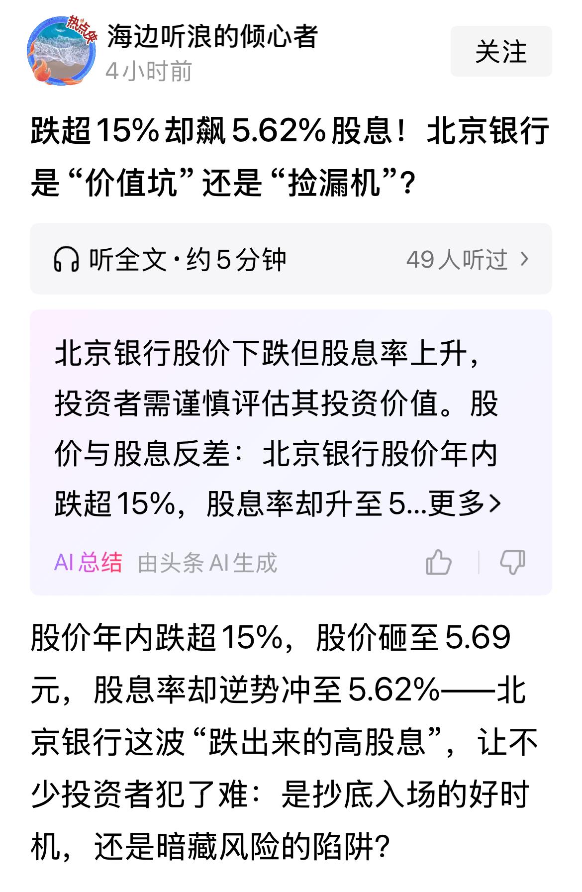 看你是持什么投资策略,对以炒股赚取差价的投资者来说是个垃圾股或者说是鸡肋股,而对长期持股收息的投资者来说是个金股。 以下两点是比较确定的: 一、北京行是42家A股上市公司之一,这42家银行是中国最优质银行代表。业绩发展的确定性预期较高,倒不了。虽然第一大股东是外资银行,但具有国资背景的股东合计持股占比超过50%,北京行是具有国资背景的银行。 二、股息率目前在42家银行中排名第二,达5.67%,仅次于华夏的5.87%。从历年的分红情况来看这个股息率在股价不涨或下跌的前提下是可以长期保持的。在两种情况下它的股息率会下降,一是股价上涨,二是净利润大幅度下降。 是鸡胁股还是金股呢?