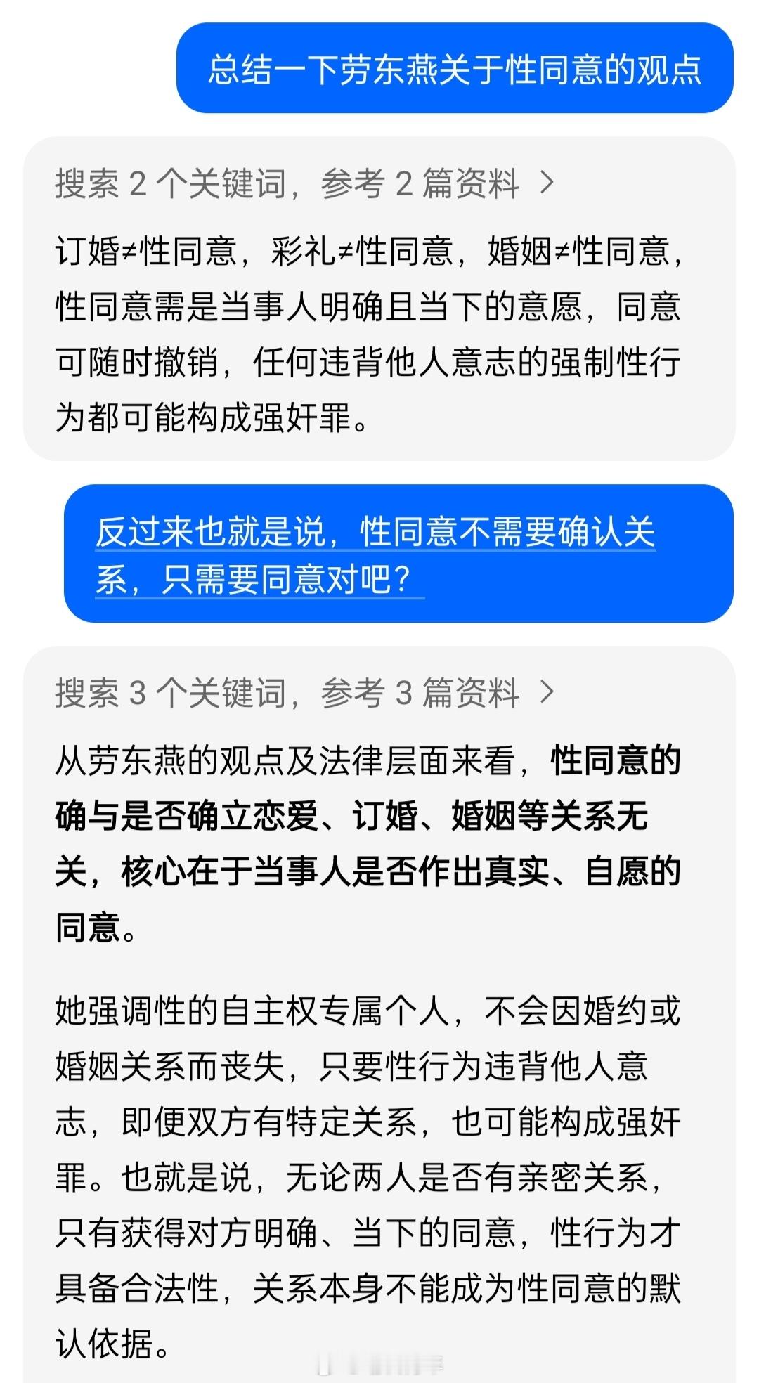 其实我挺支持劳东燕教授的。她说性同意和恋爱结婚无关。也就是只要女方明确同意,哪怕