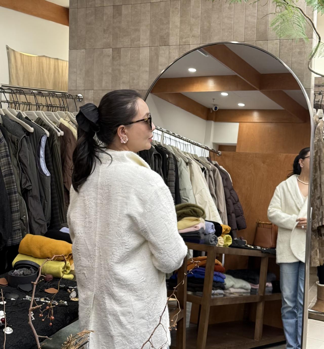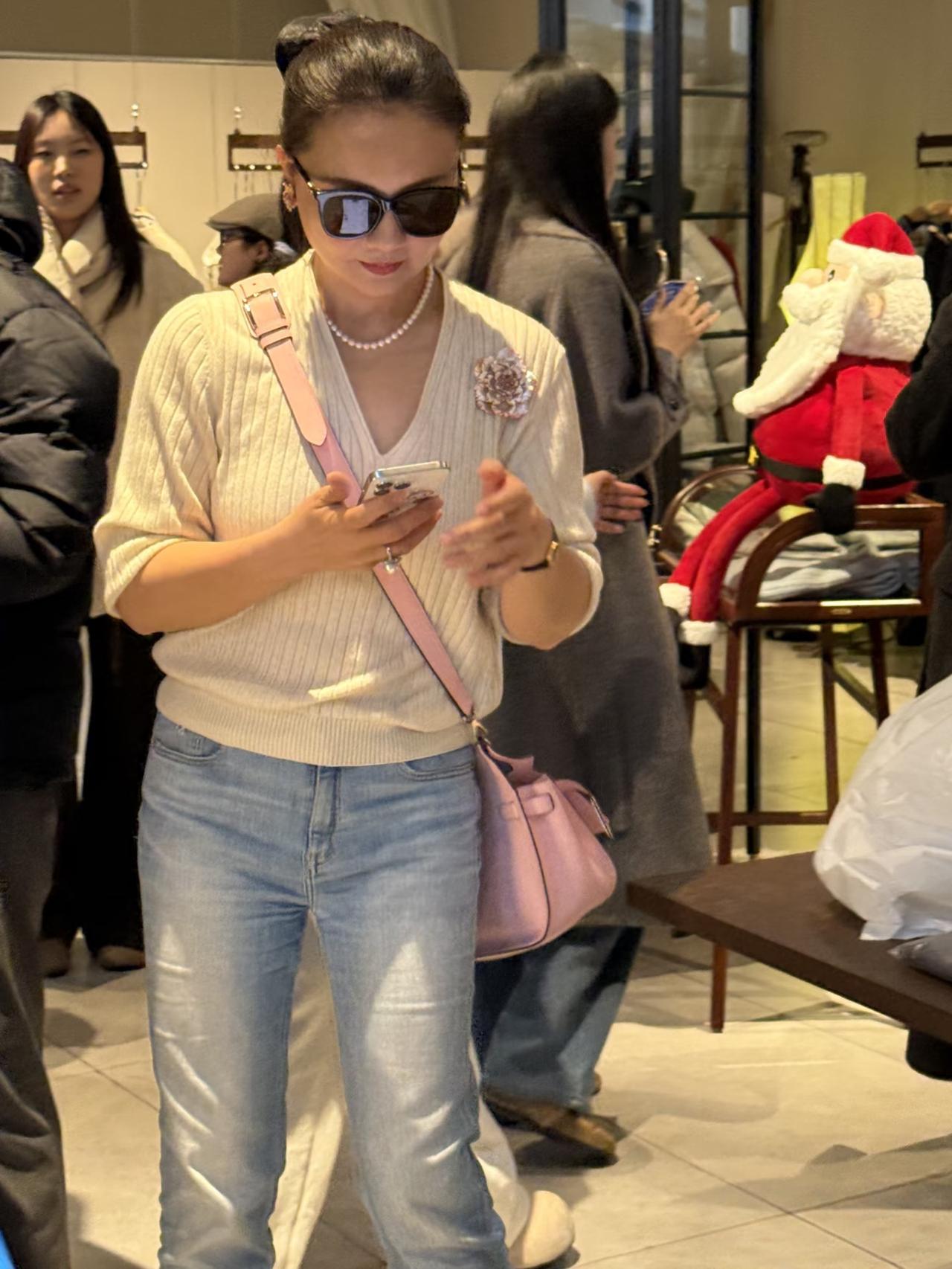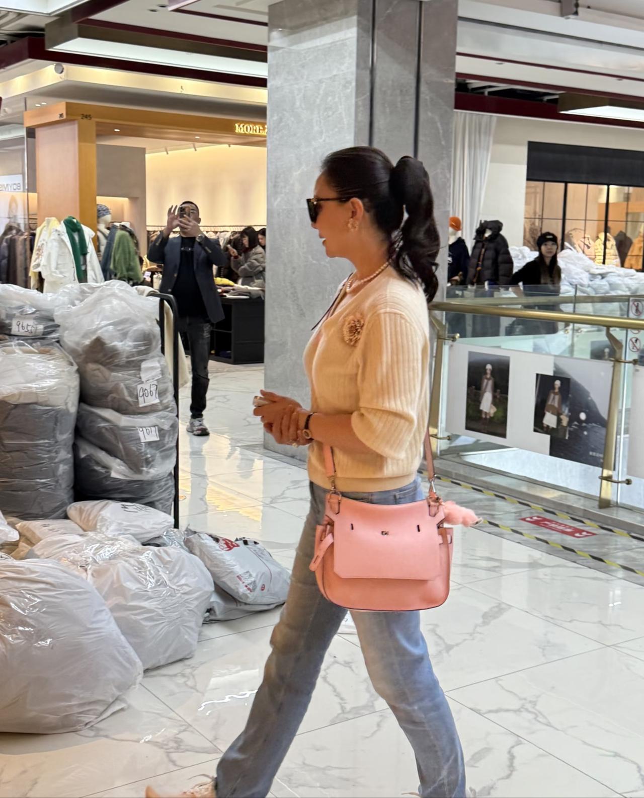 “槿汐姑姑”孙茜现身杭州女装大厦购买衣服,她穿着一身日常服饰,背着粉红色包包,打