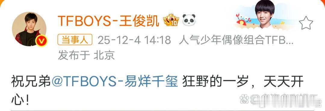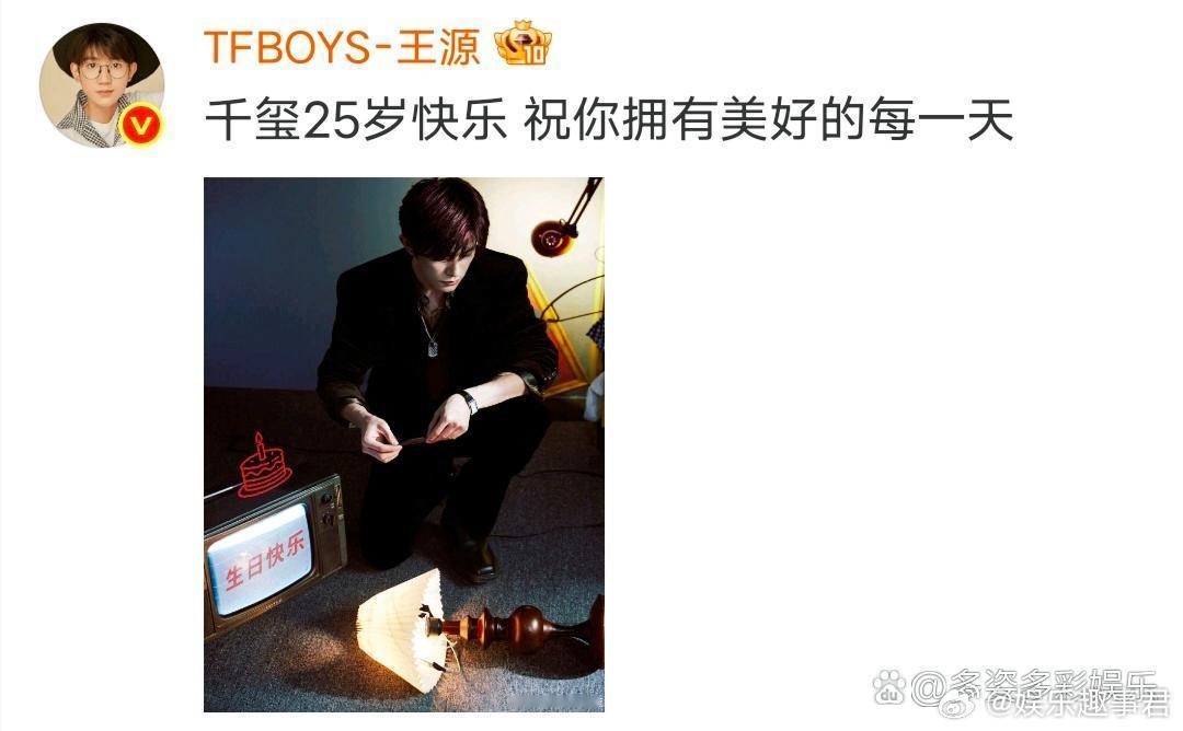 易烊千玺25岁啦!过生日的他收到好兄弟王俊凯、王源的祝福,两人不约而同晒出易烊千