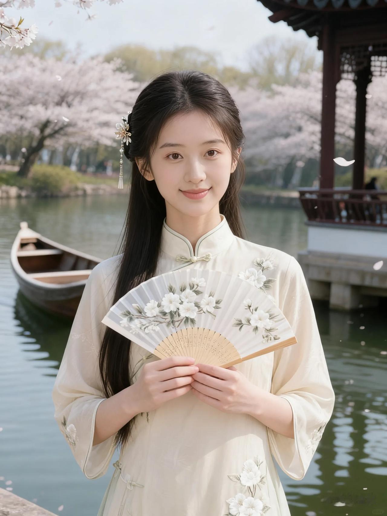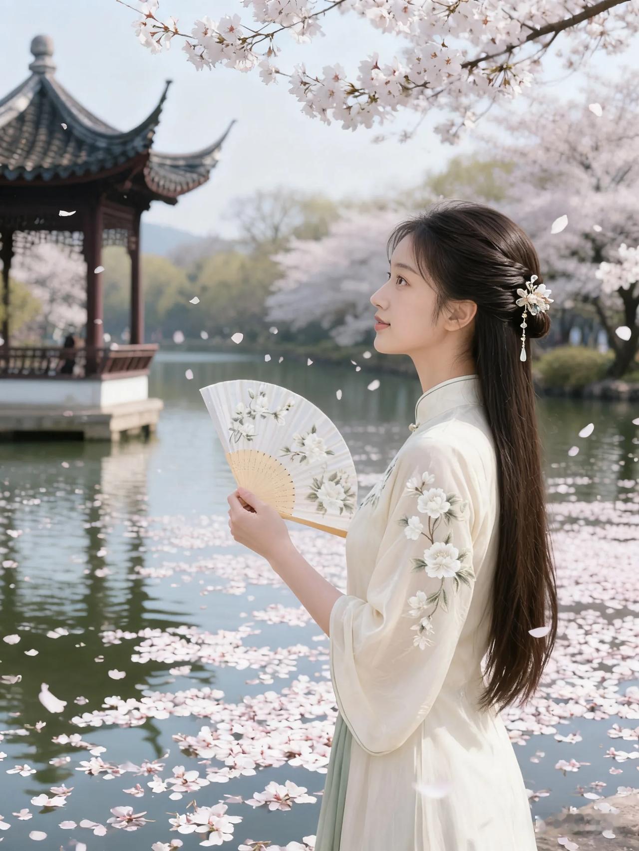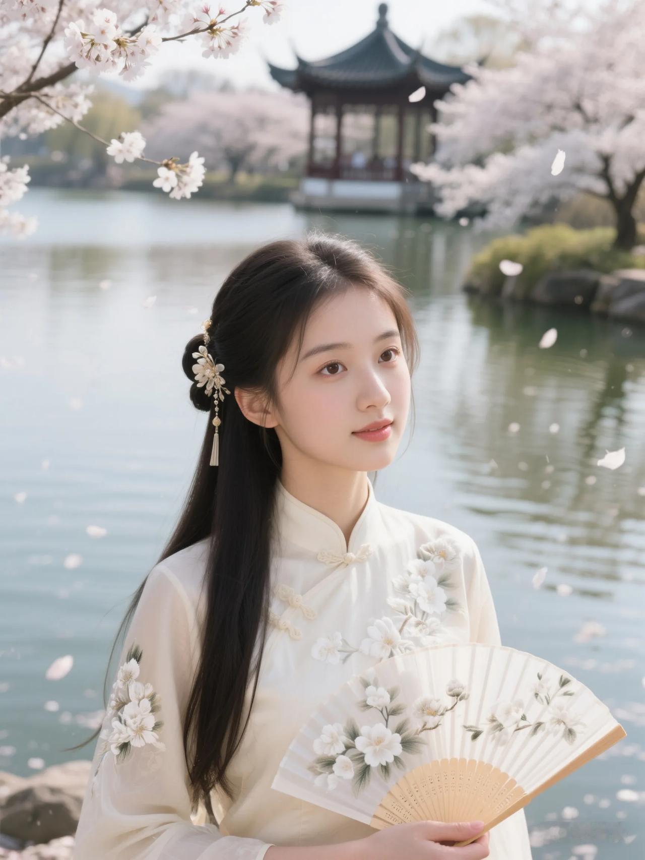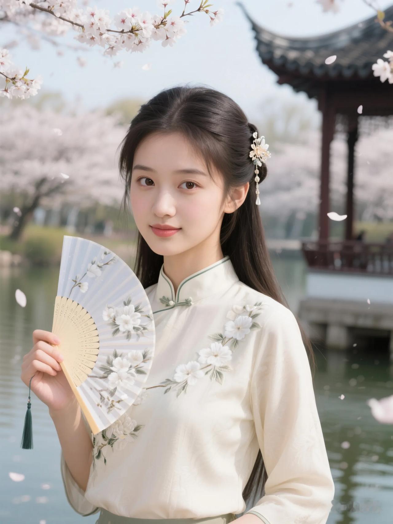 樱花树下,古风少女,手持折扇,唯美如画。